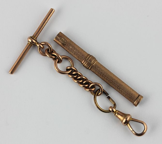 Part of a 9ct gold watch chain and a gold cased sliding toothpick, the watch chain fitted with a T bar and a swivel, the toothpick detailed 9ct, combined gross weight 10g note - base metal D shaped link to the chain