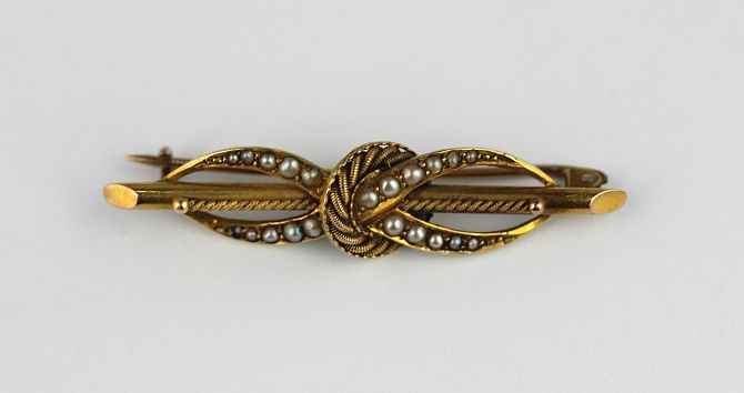 A gold and seed pearl bar brooch in a twin scroll and circular ropetwist design, detail 15ct, length 4.7cm, gross weight 4.2g