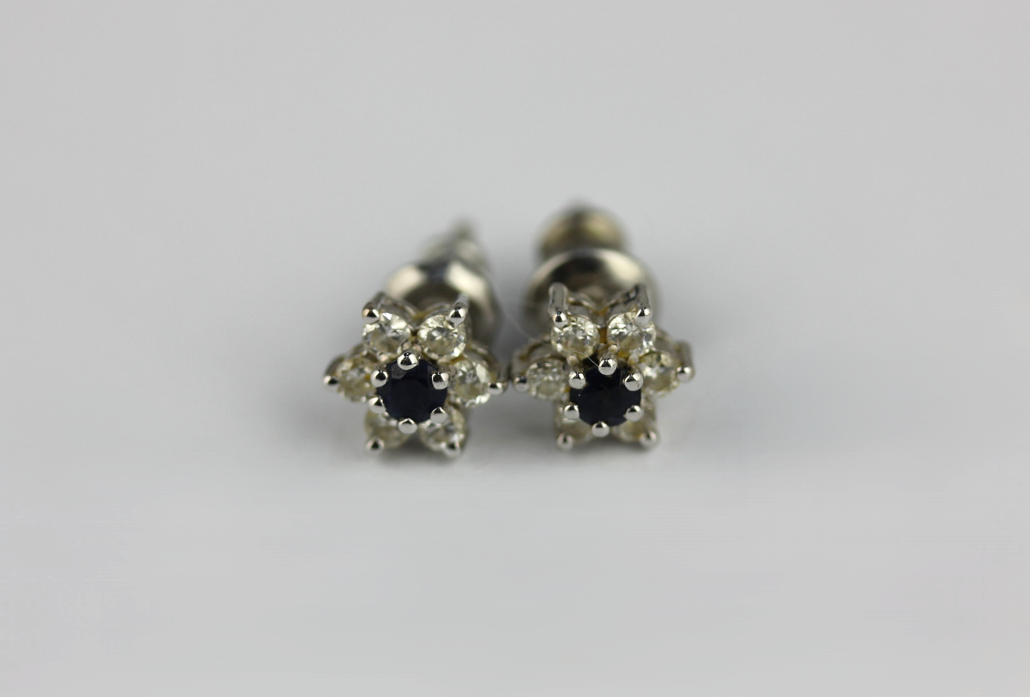 A pair of 18ct white gold sapphire and diamond 7 stone cluster ear studs with post fittings, gross weight 1g with ditffering base metal back fittings
