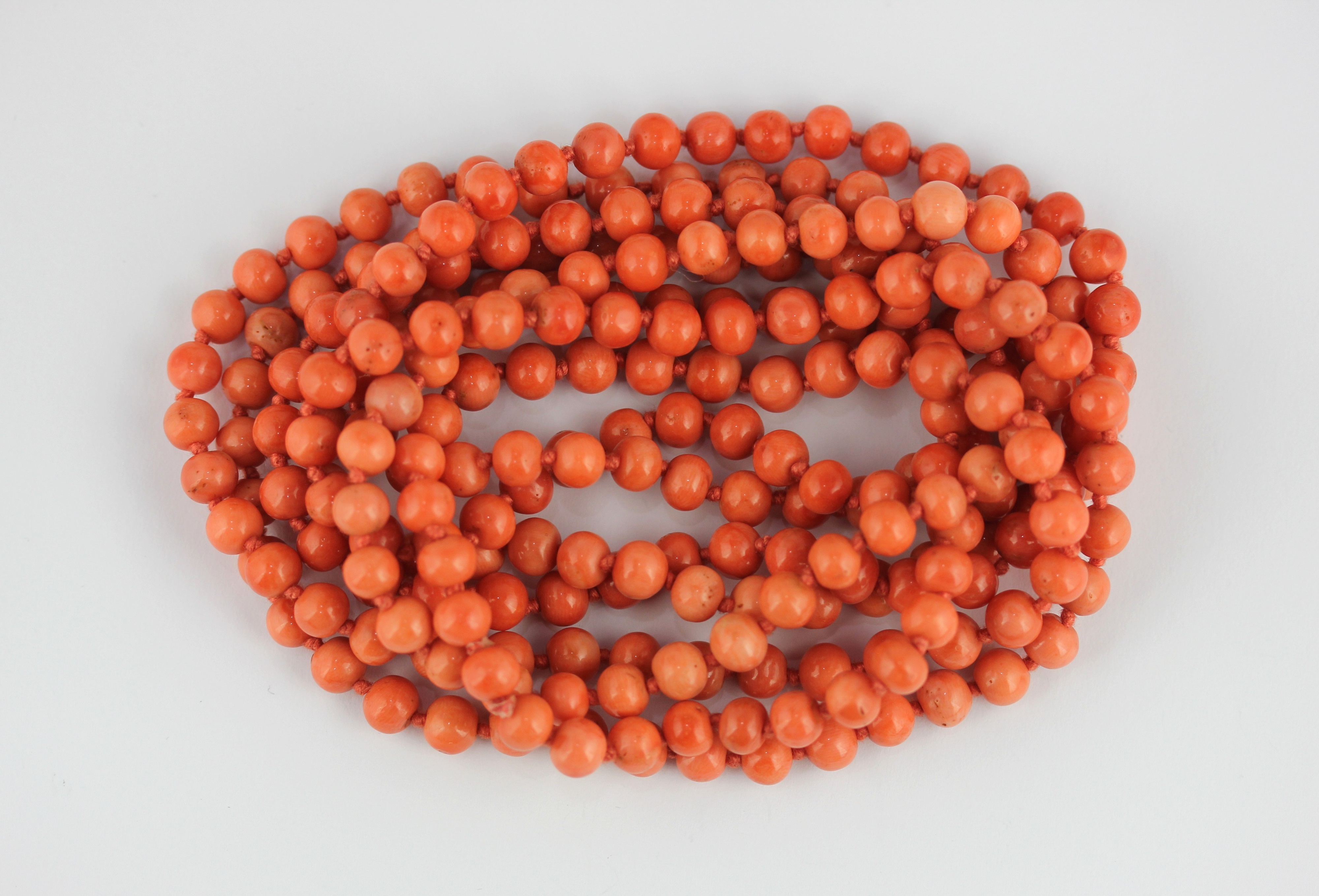 A long single row necklace of coral beads, length 184cm, gross weight 107g