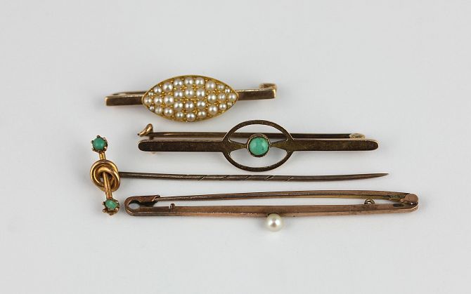 3 brooches and a stick pin comprising a gold and seed pearl marquise shaped cluster bar brooch unmarked, a gold bar brooch mounted with s single pearl, a gold and turquoise bar brooch, detail 9ct and a turquoise stick pin, combined gross weight.8.6g