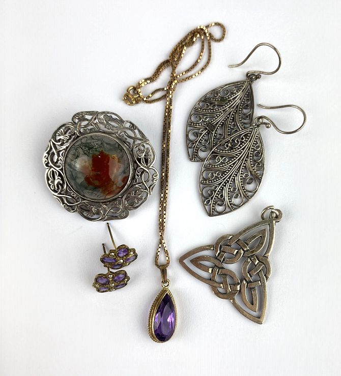 A 9ct gold and mother of pearl drop shaped pendant with a 9ct gold box link neckchain and a pair of 9ct gold, amethyst and seed pearl earrings with post fittings, combined gross weight 4.7g, a silver and moss agate brooch, a pair of filligree earrings detailed 925 and a silver triangular pendant in a Celtic design