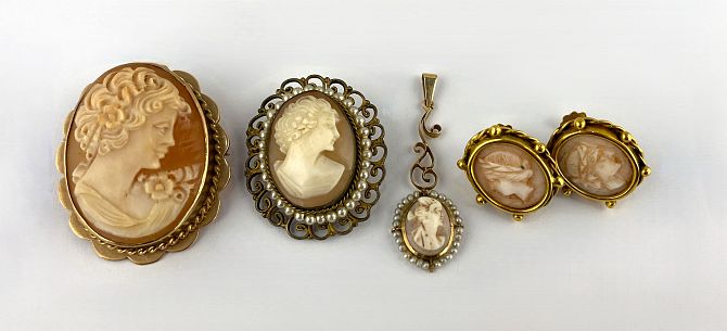 4 items of cameo jewellery comprising a gold mounted oval shell cameo brooch carved as a portrait of a lady within a ribbon twist surround detailed 9ct, a shell cameo and imitation pearl brooch, a gold mounted cameo and seed pearl pendant and a pair of cameo earrings, the screw fittings detailed 9ct.