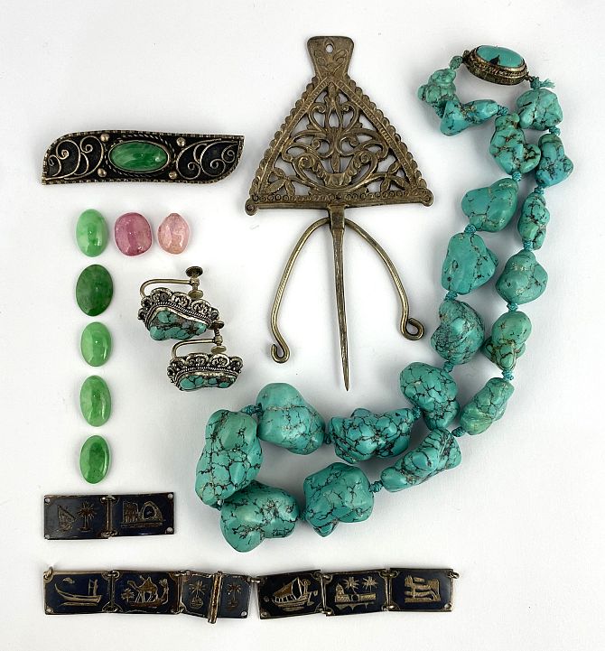 A group of jewellery comprising a graduated turquoise matrix necklace, a pair of similar earrings, a green paste brooch, a miello bracelet, an asian hair ornament and 7 unmounted gem stones