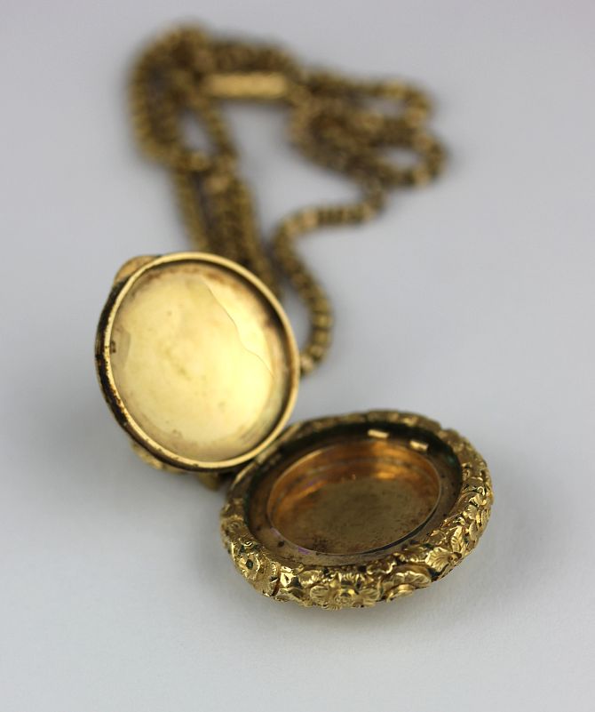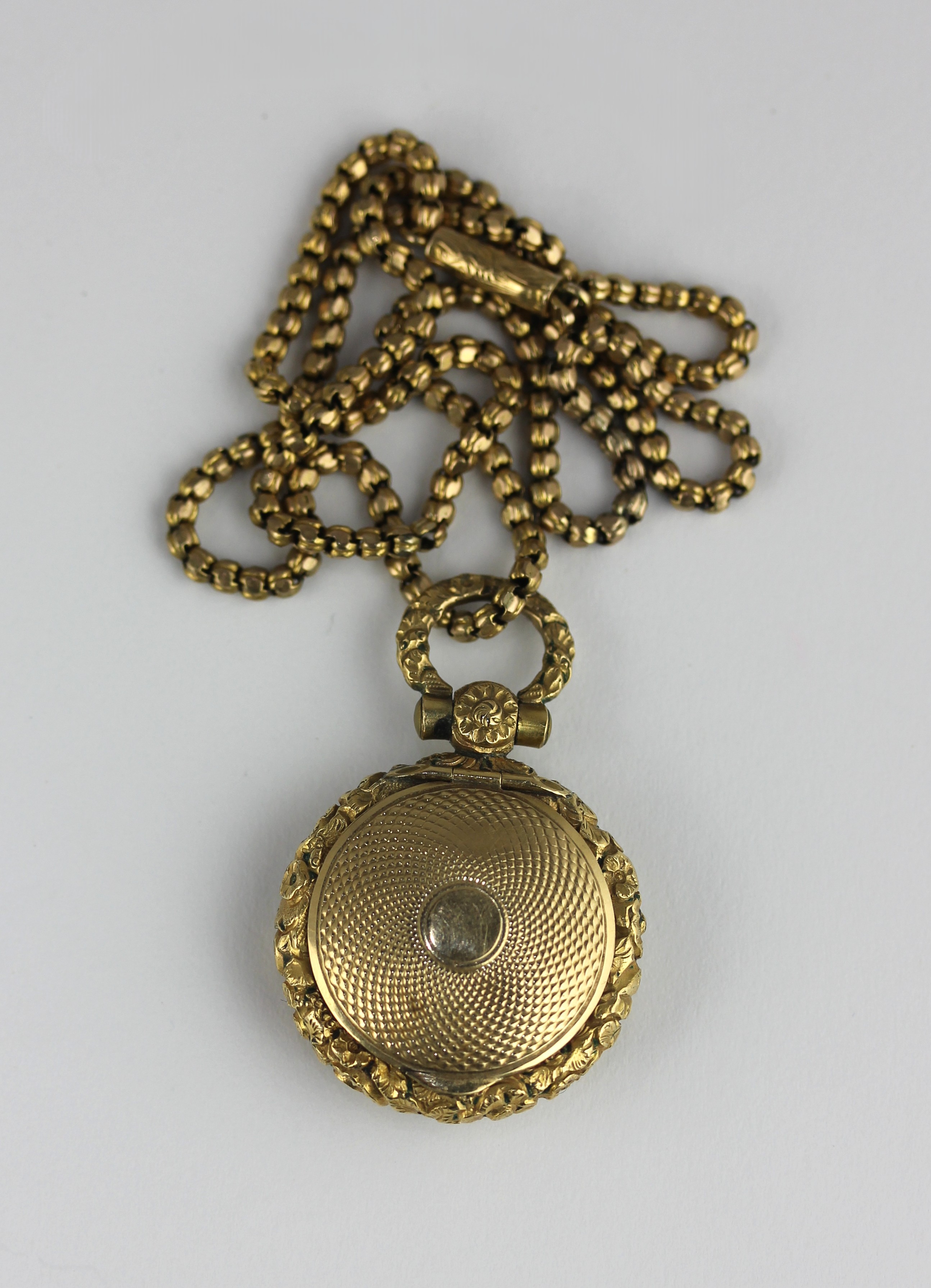 A mid 19th century gilt metal circular pendant locket 2.5cm diameter, with a gold neckchain length 39.5cm, weight of neckchain 6.2g