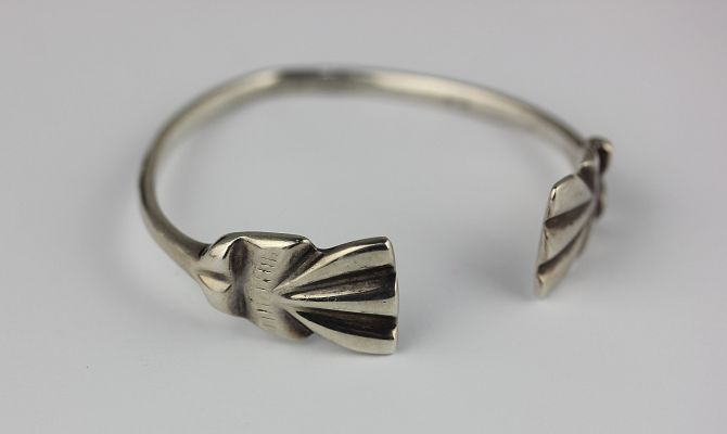 A silver bangle of Mexican or South American style detailed 925 21.2g