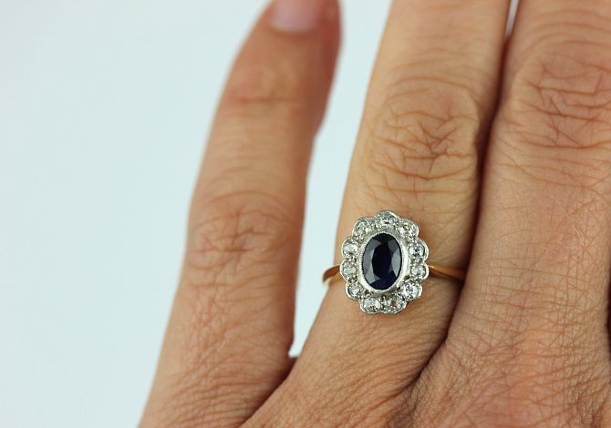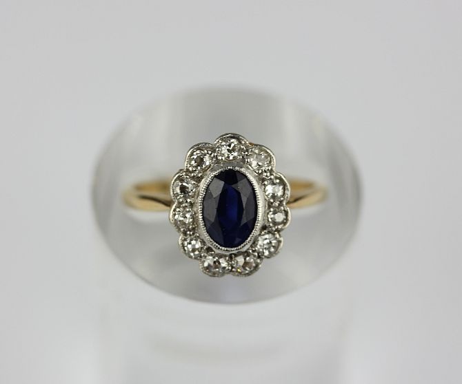 A gold, sapphire and diamond cluster ring, collet set with an oval cut sapphire in a surround of cushion shaped diamonds, detailed 18ct, size L, gross weight 3.1g, with a case