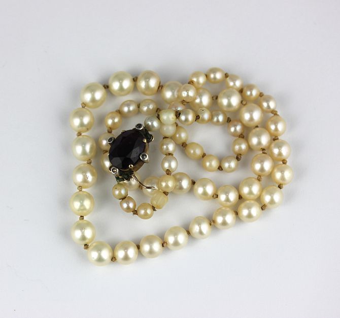 A single row necklace of graduated cultured pearls on an amethyst and diamond set clasp, length 44cm