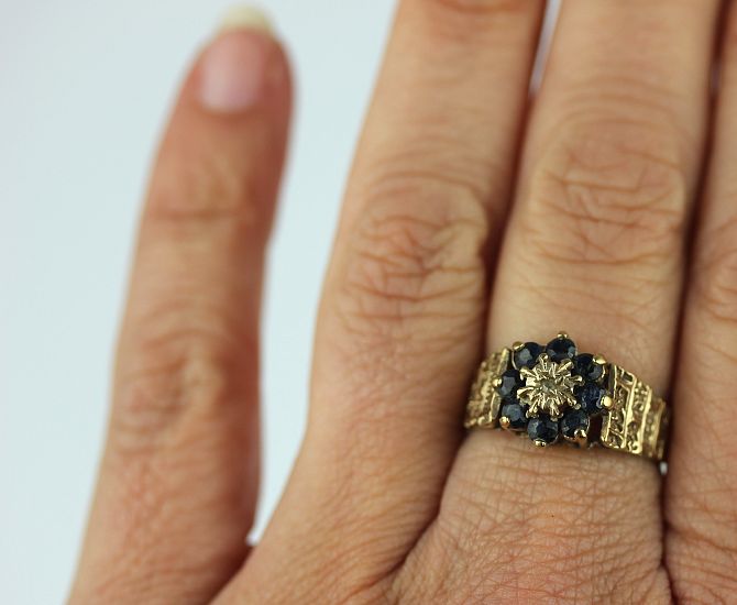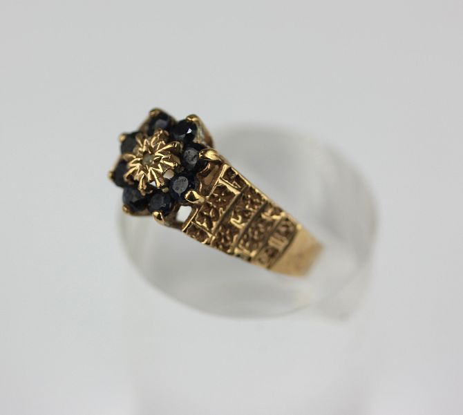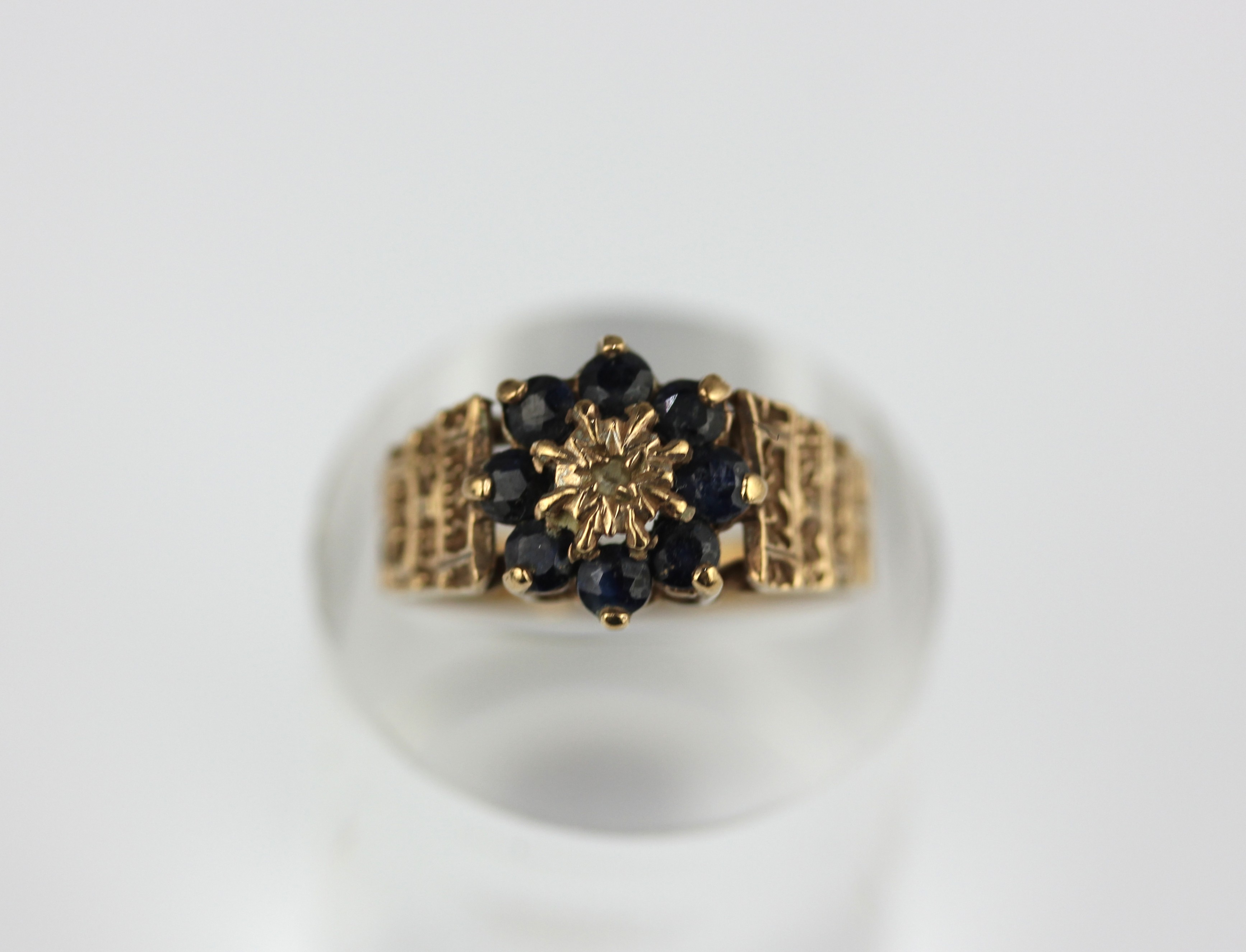 A 9ct gold, sapphire and diamond nine stone cluster ring, size O 1/2, gross weight 3.5g