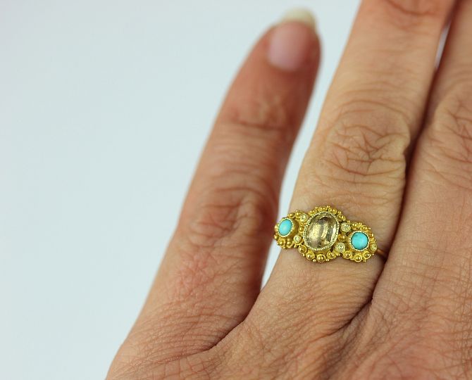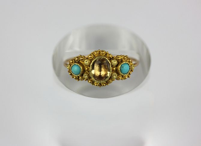 An early 19th century gold, foil backed topaz and turquoise three stone ring with beaded decoration, unmarked, size J, gross weight 1.2g