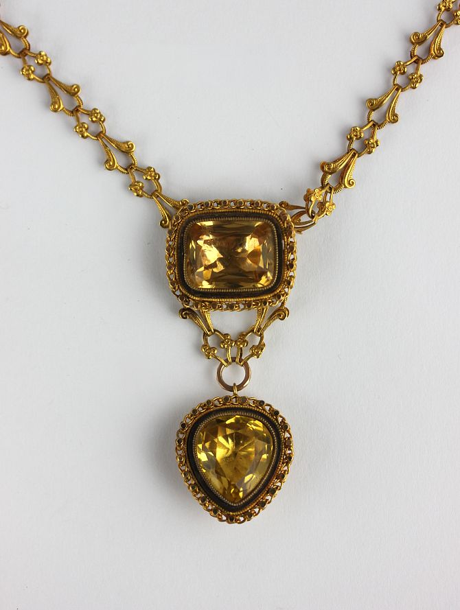 A gold and foil backed yellow gemset pendant necklace with a scroll and trefoil link neckchain on a snap clasp, length 38cm, gross weight 16g