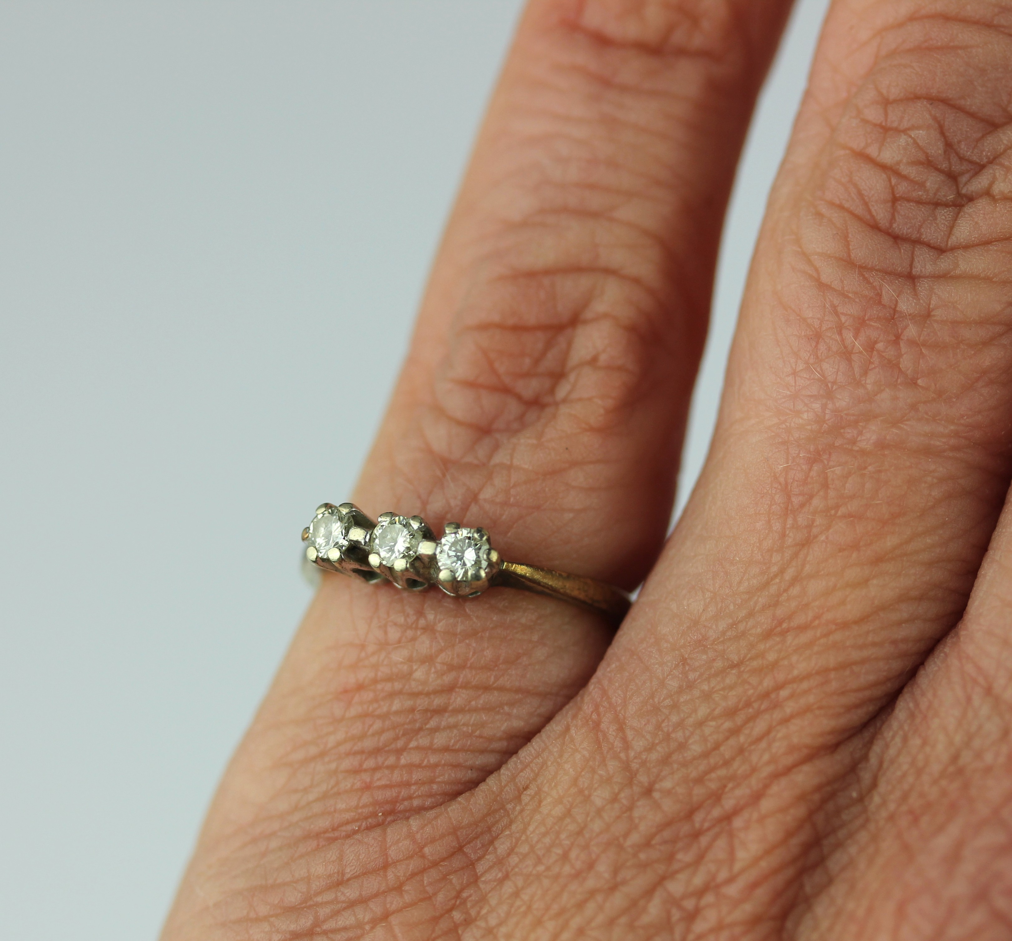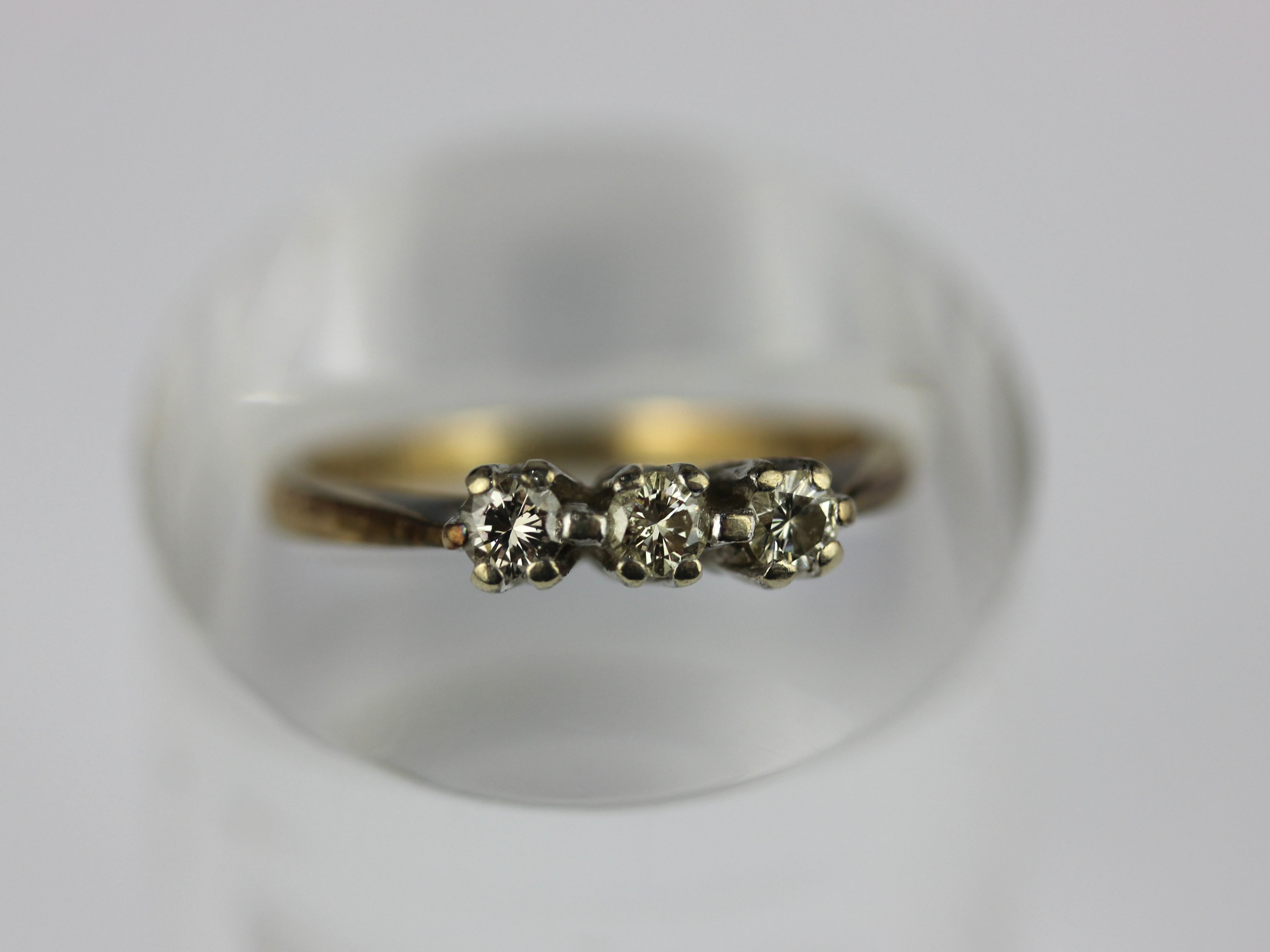 A 9ct gold and diamond three stone ring, claw set with circular cut diamonds