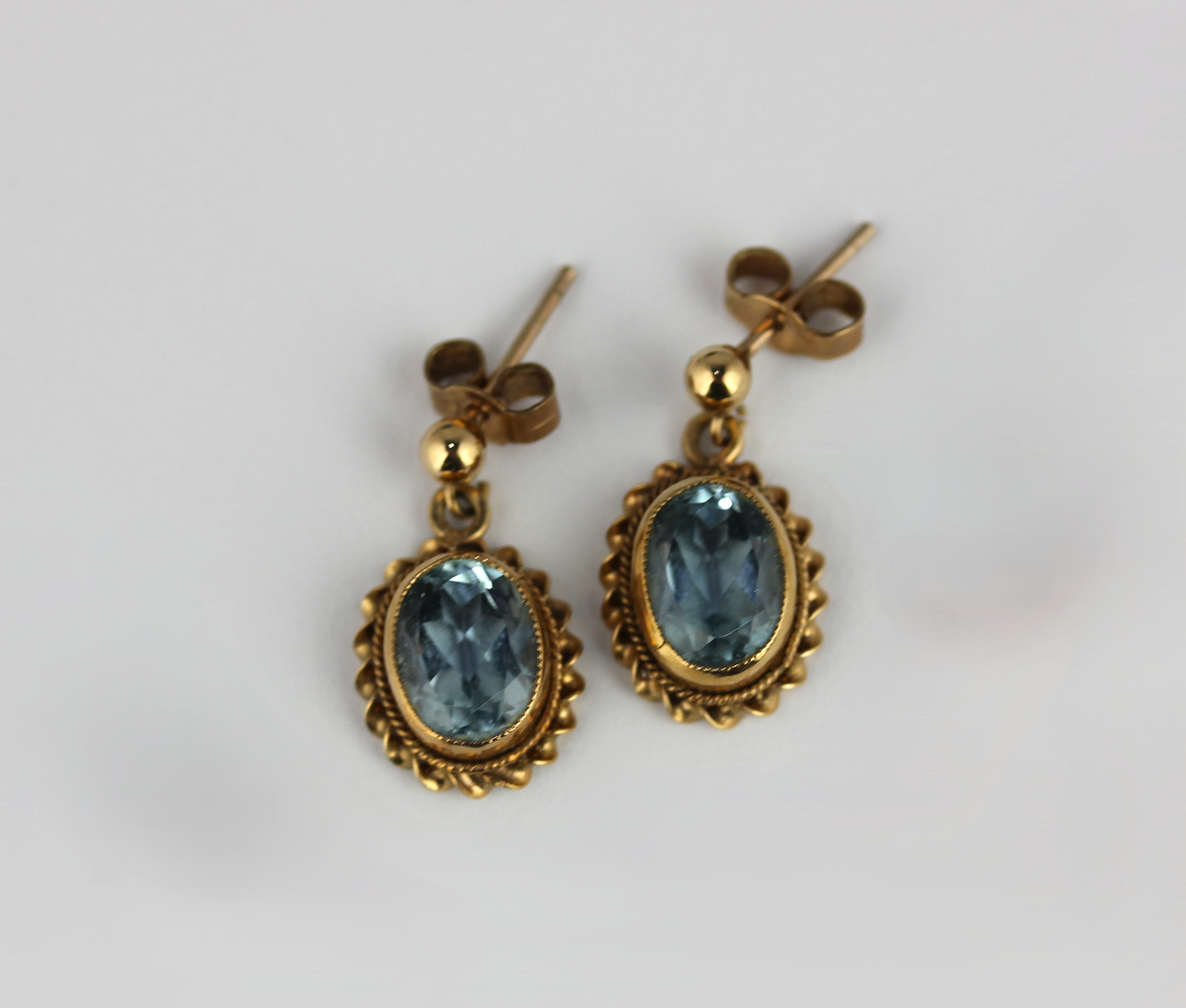 A pair of 9ct gold and pale blue gem stone set pendant earrings each with ribbon twist surround to the central gemstone and with post and butterfly fittings, with a case