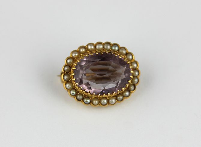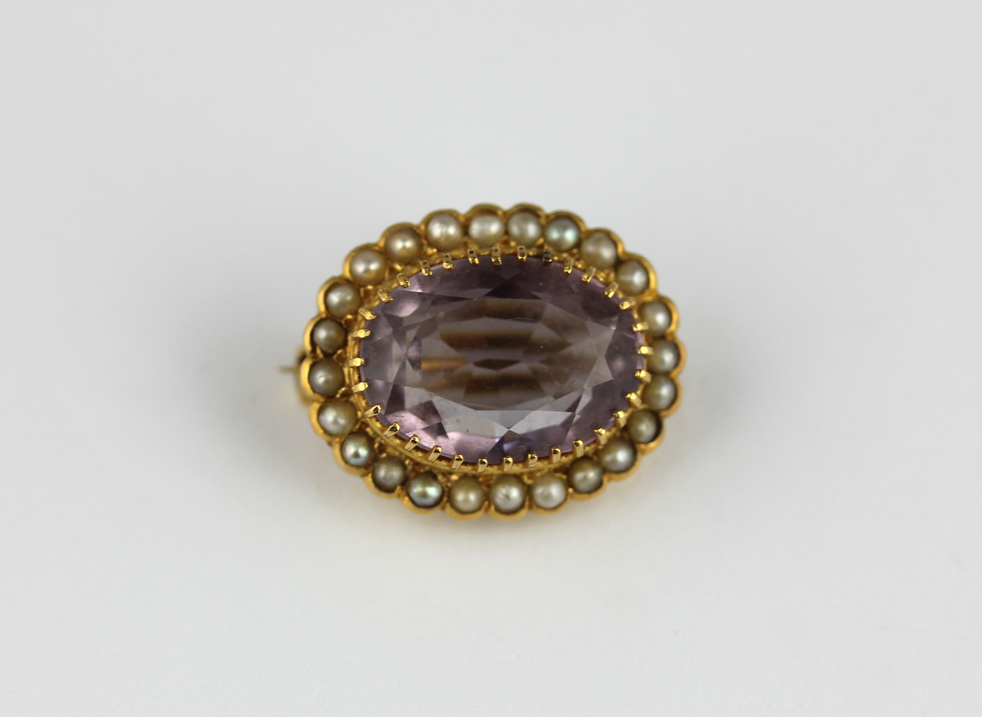 A gold amethyst and half pearl brooch claw set with oval cut amethysts in a surround of half pearls, length 2.2cm unmarked, gross weight 6.9g