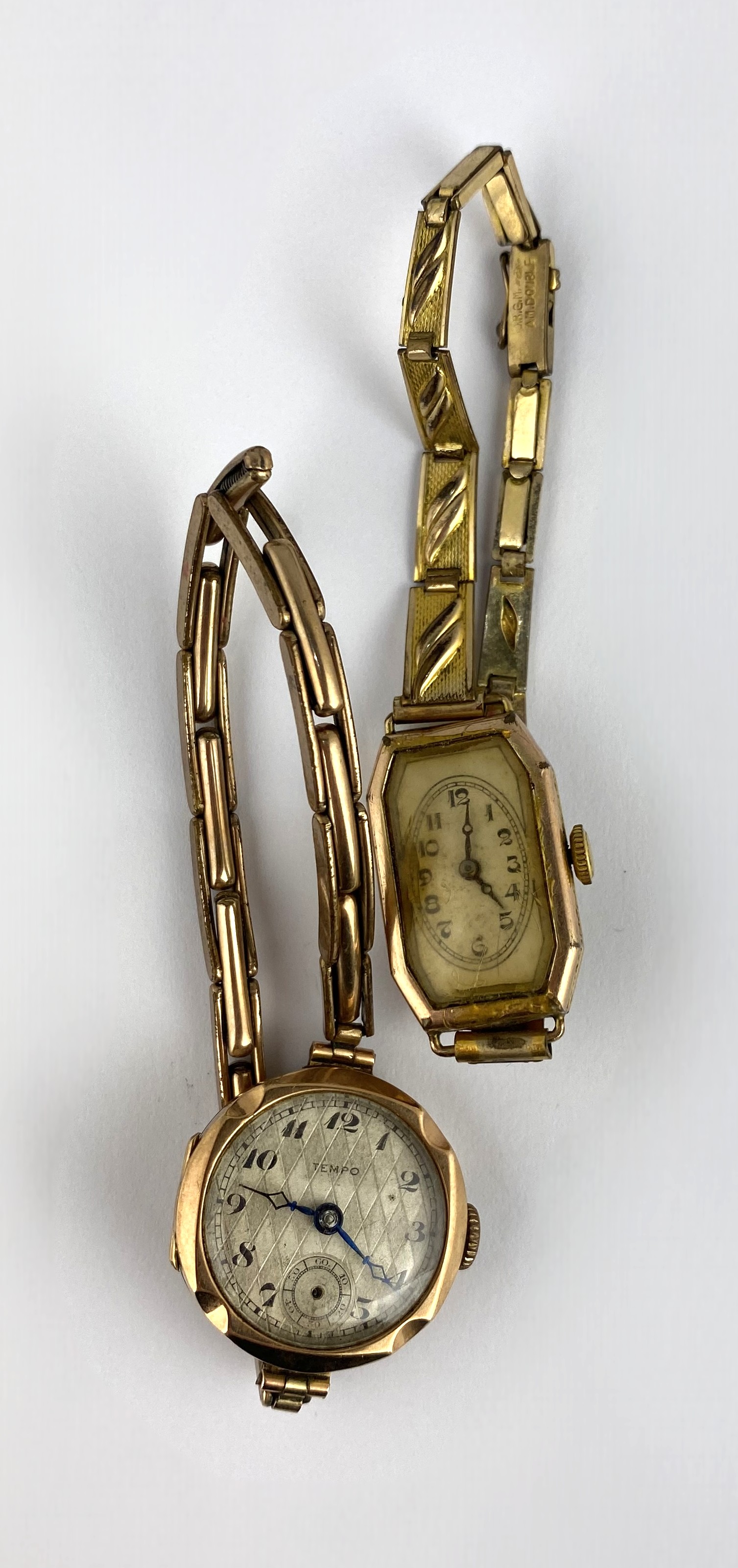 2 ladies wristwatches comprising a Tempo 9ct gold circular cased wristwatch, import mark Glasgow 1929 on a gilt metal expanding bracelet and a gilt metal retangular cased bracelet wristwatch.