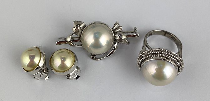 A white gold and mabe pearl ring, indistinct mark, a mabe pearl brooch, indistinct mark, and a pair of imitation pearl costume ear clips
