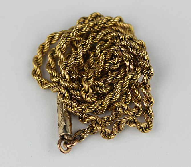 A gold ropetwist link neckchain on a cylindrical clasp, length 41.5cm, weight 7.2g