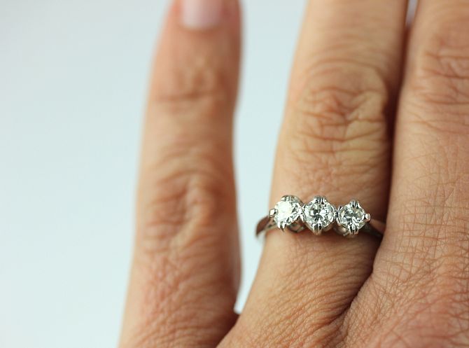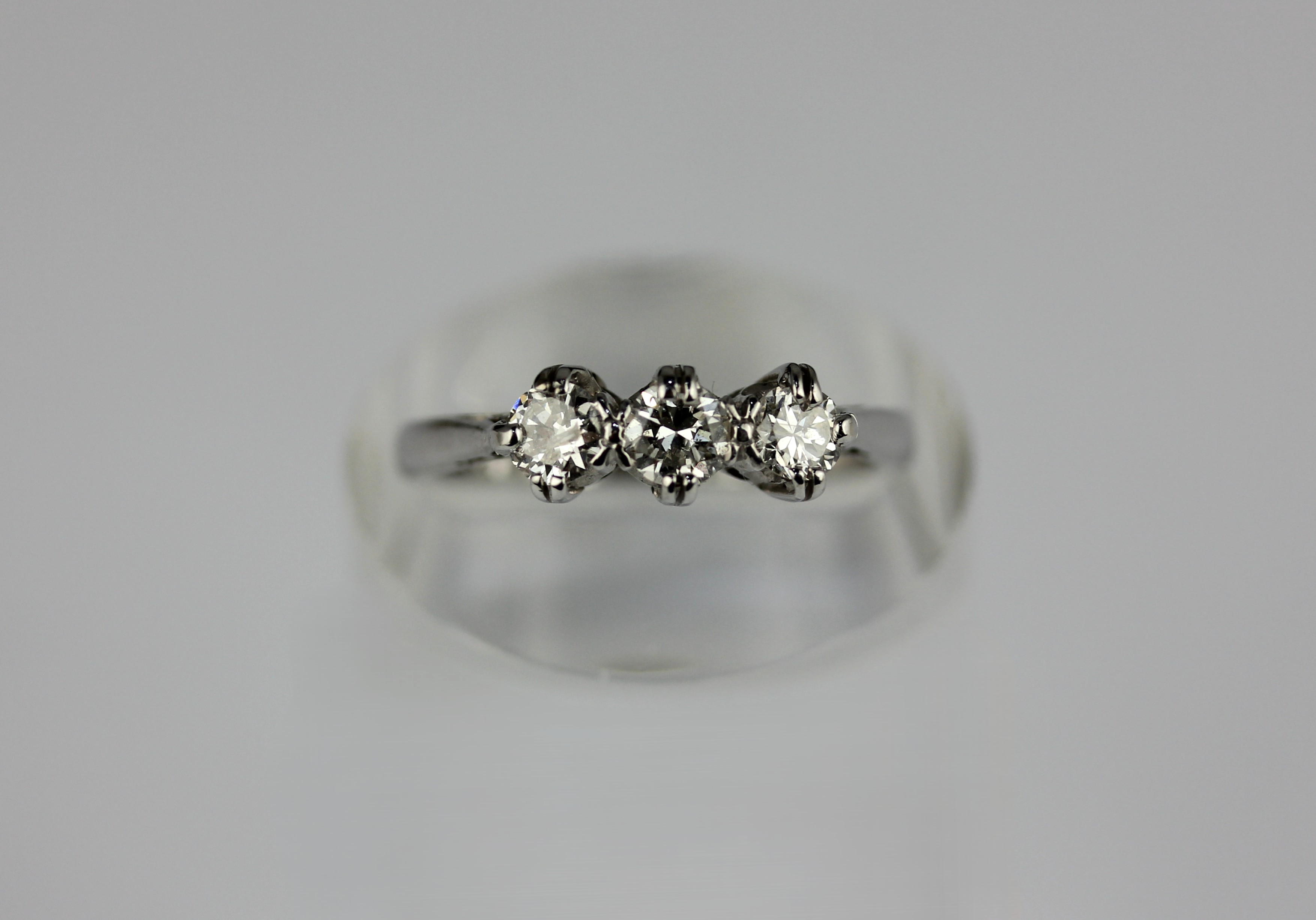 A diamond three stone ring claw set with circular cut diamonds, size K, note sizing to shank, gross weight 4g