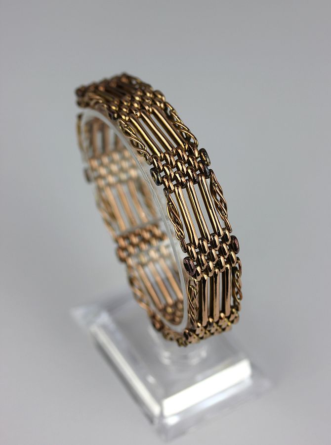 A gold bar, twist bar and oval link gate bracelet on a snap clasp, detailed 9ct, 24.8g