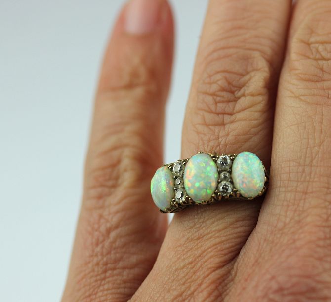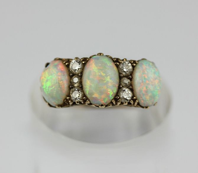 A gold, opal and diamond ring, claw set with three oval opals and with two diamond three stone divisions at intervals, the mount with scroll decoration to sides, detailed 18, ring size N, gross weight 5.7g (chip to opal)