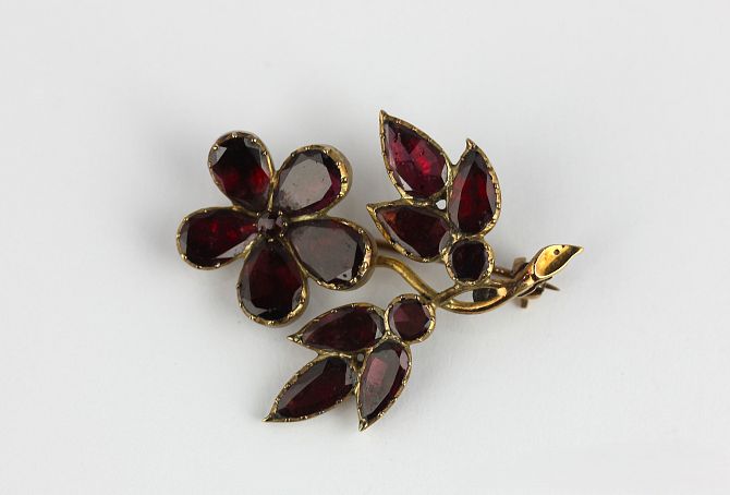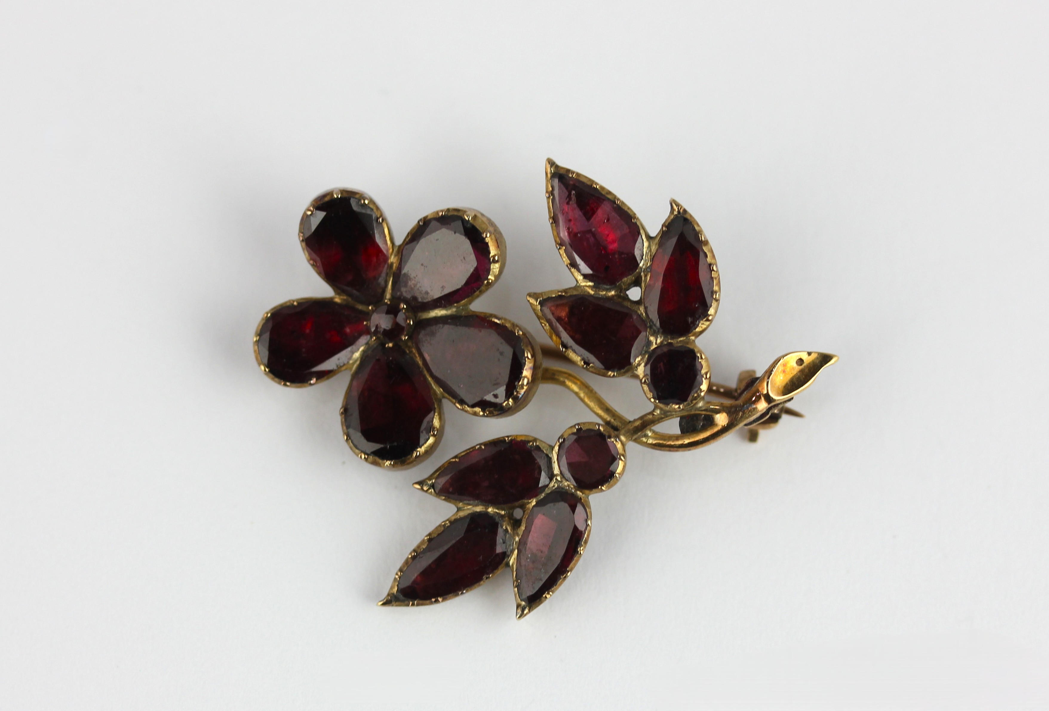 A gold and foil backed flat cut garnet set brooch designed as a floral and foliate spray, circa 1800, length 3.5cm, gross weight 5.5g