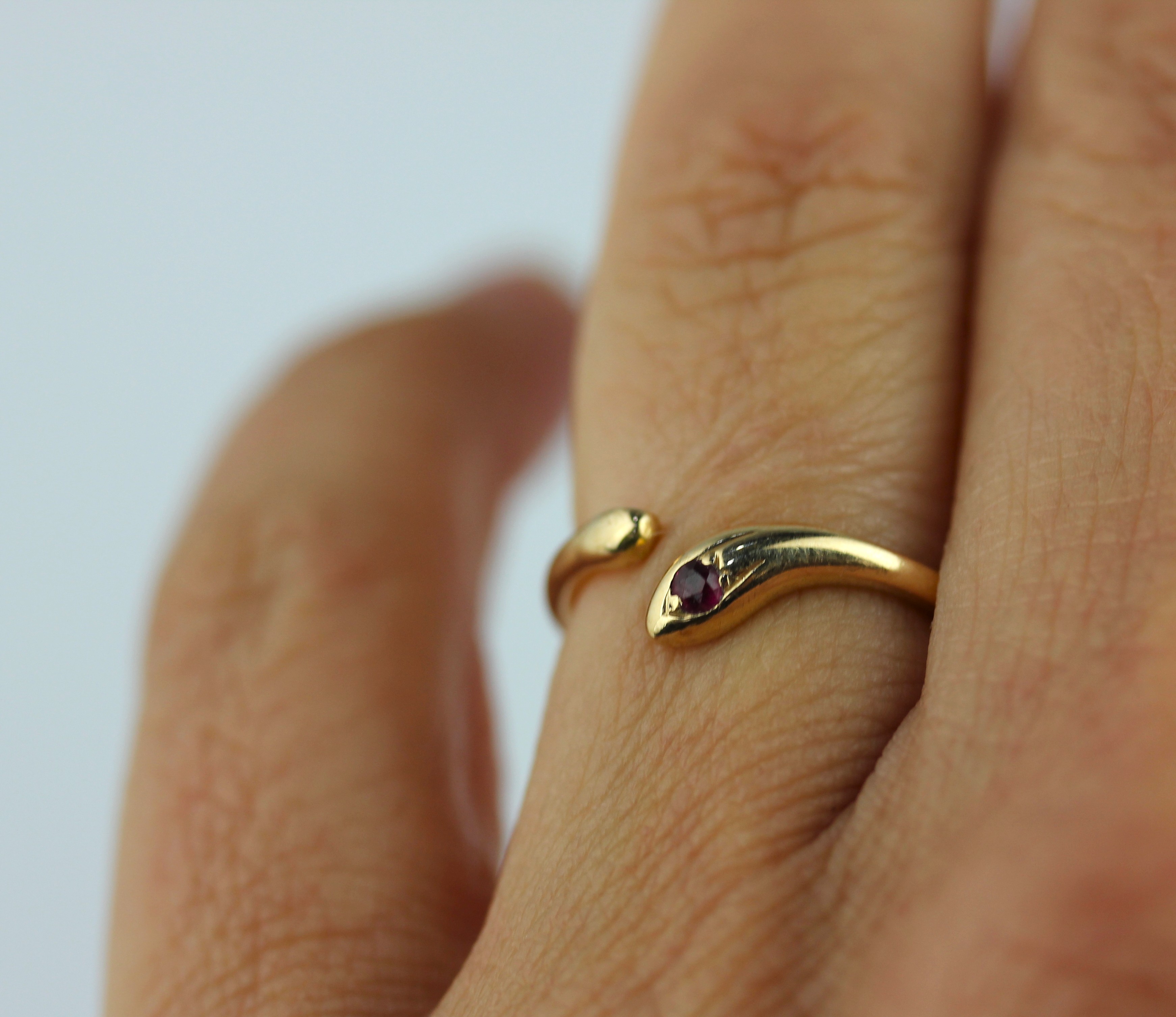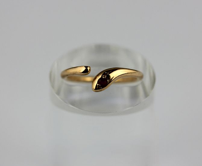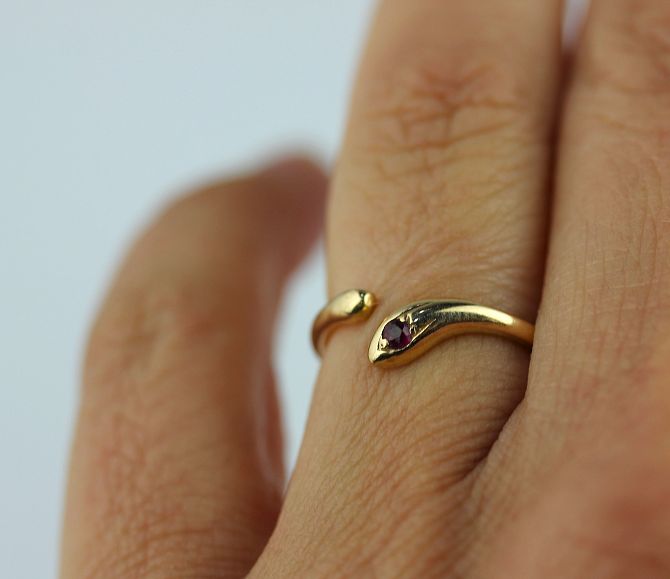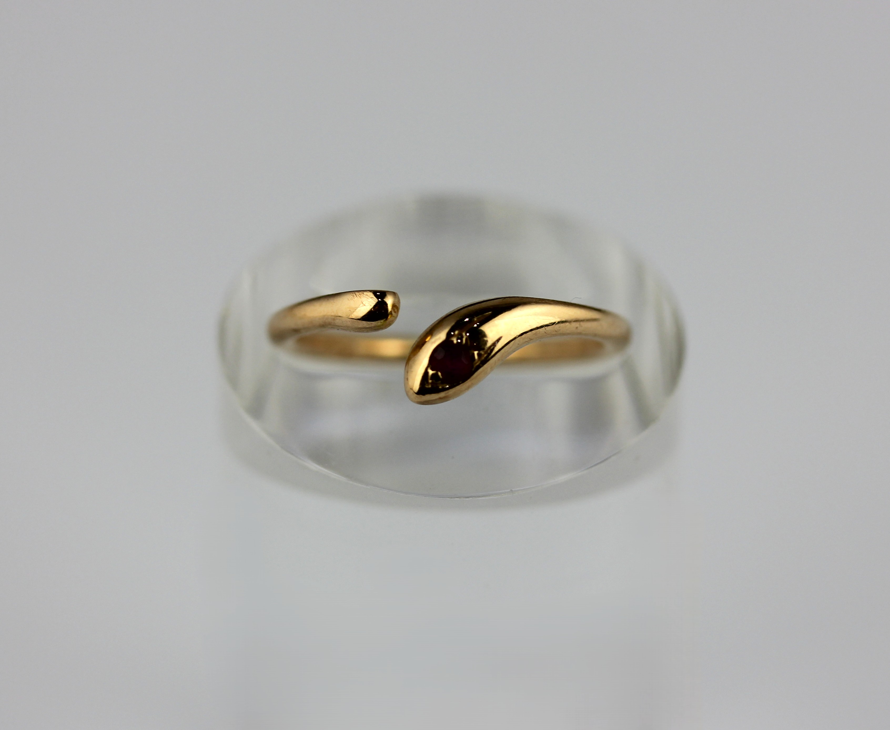 A gold and ruby ring designed as a snake, detailed 585, ring size K, gross weight 1.9g