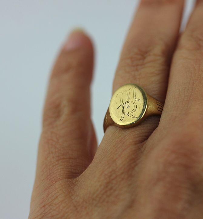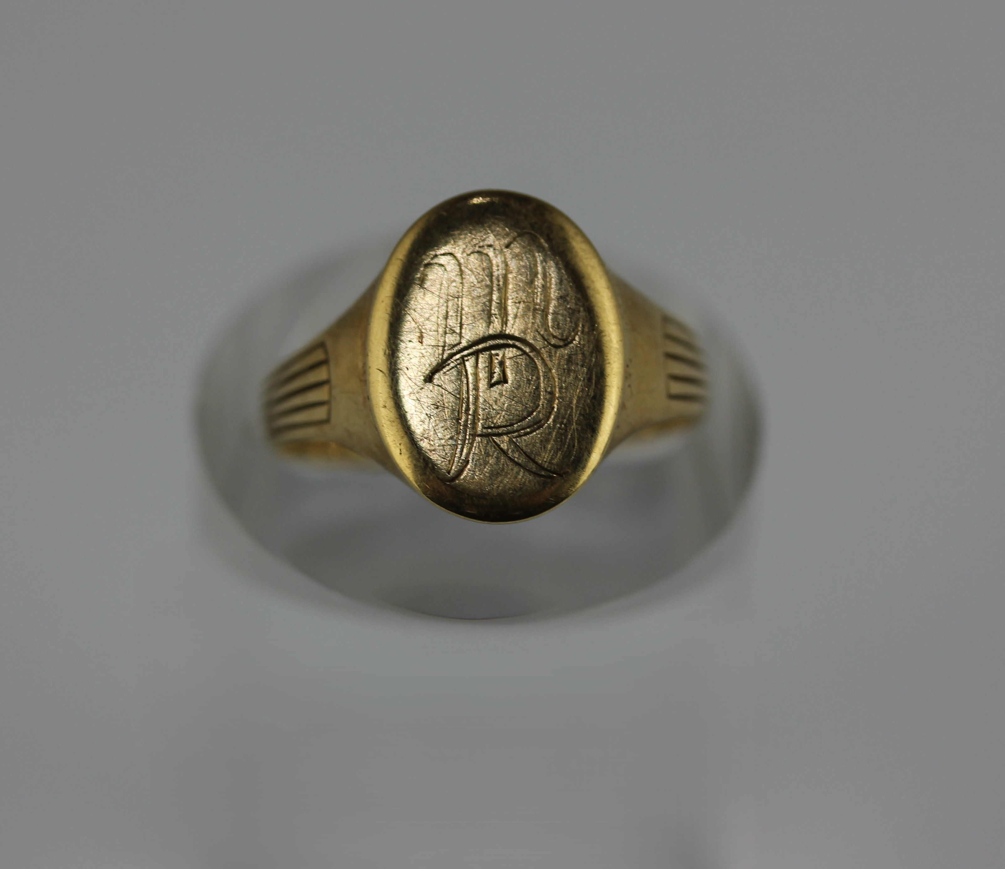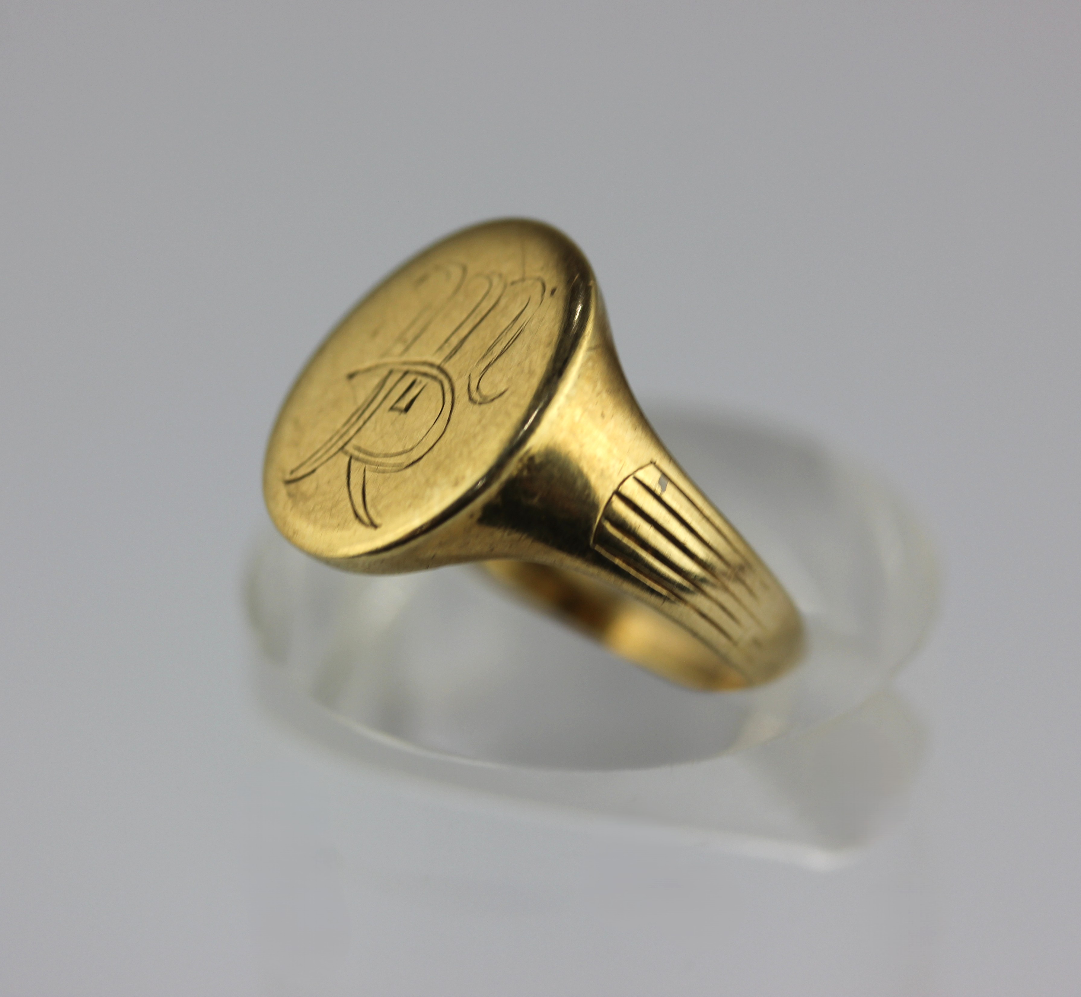 A gold oval signet ring initial engraved, detailed 585, ring size P, weight 3.3g