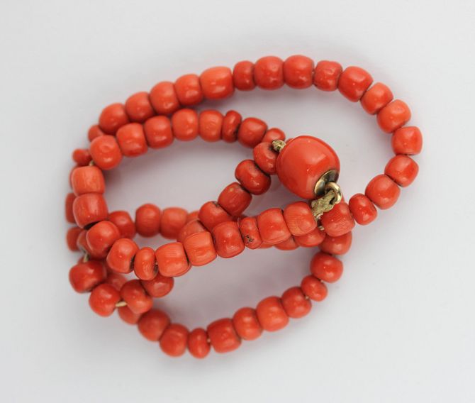 A single row necklace of coral beads on a larger coral bead clasp, length 40.5cm, gross weight 27.7g