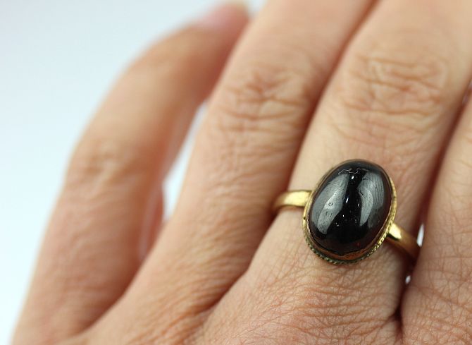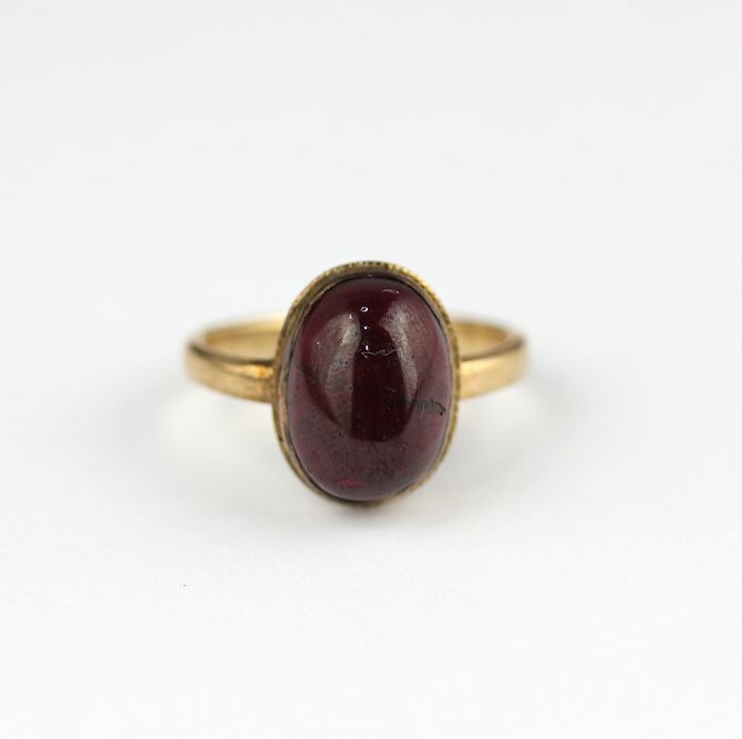 A 9ct gold ring collet set with an oval carbuncle garnet, Sheffield 1982, ring size Q 1/2, gross weight 4.6g