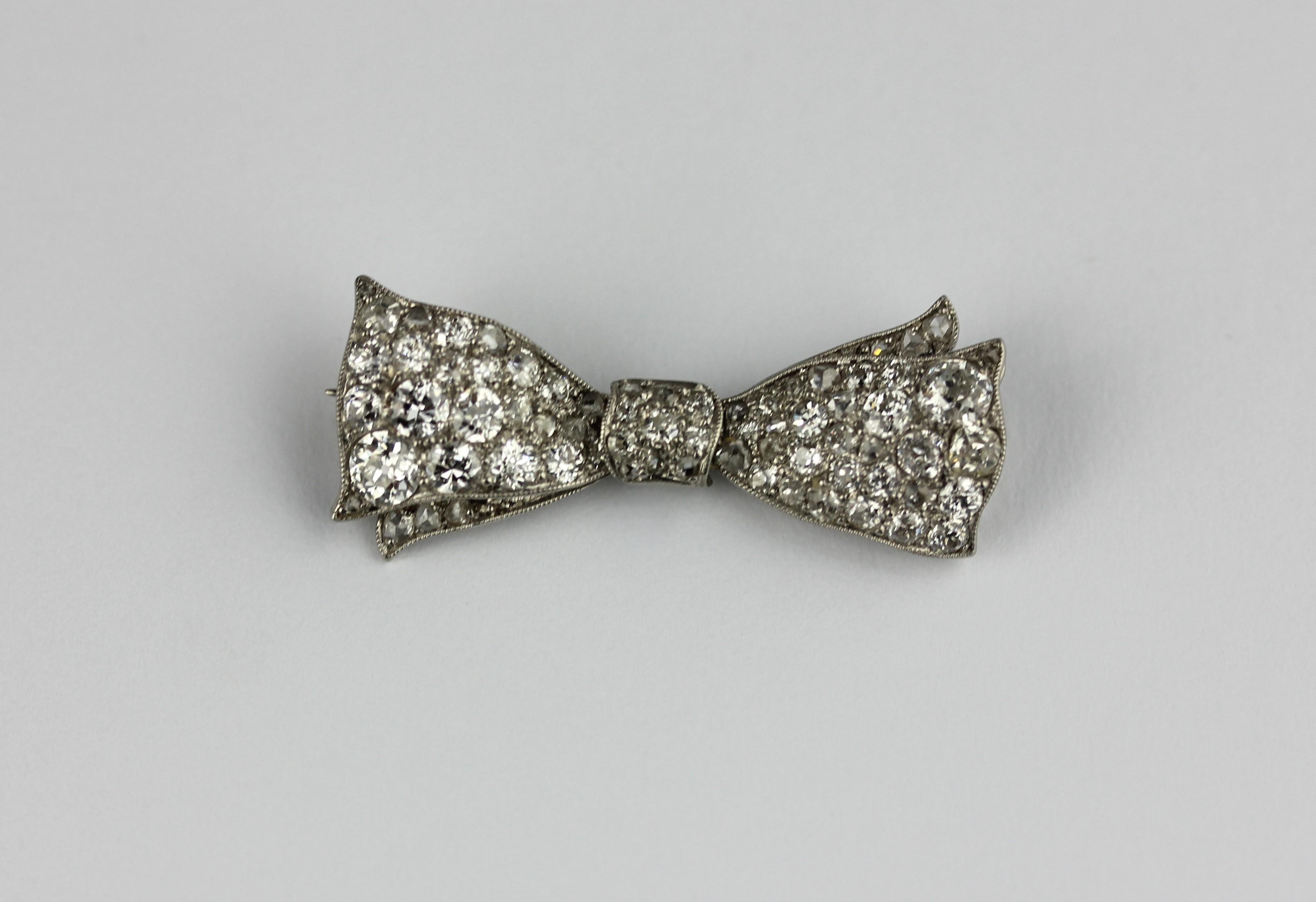 A diamond brooch designed as a bow mounted with variously cut diamonds, length 3.3cm, gross weight 5.1g