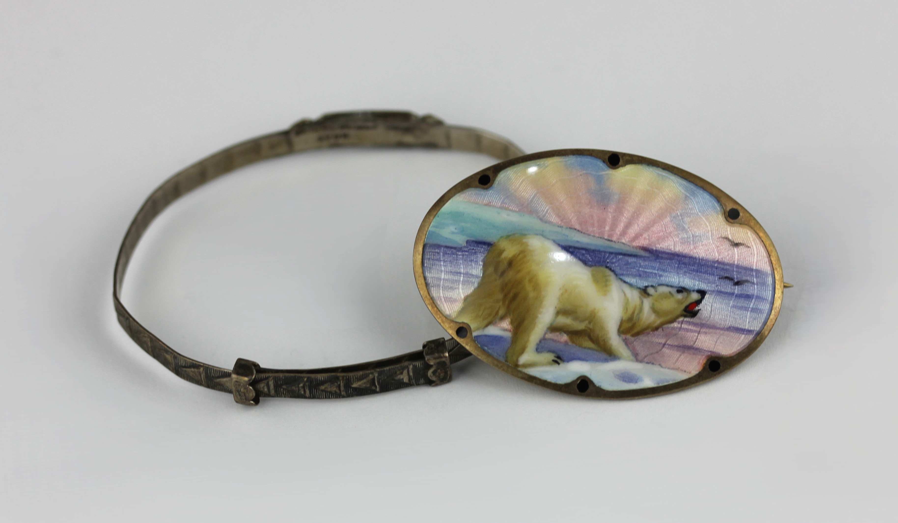 A Scadinavian silver and enamelled brooch and a silver child's bangle the brooch decorated with a polar bear in an arctic landscape, length 4cm, detailed 925 S, combined gross weight 14g