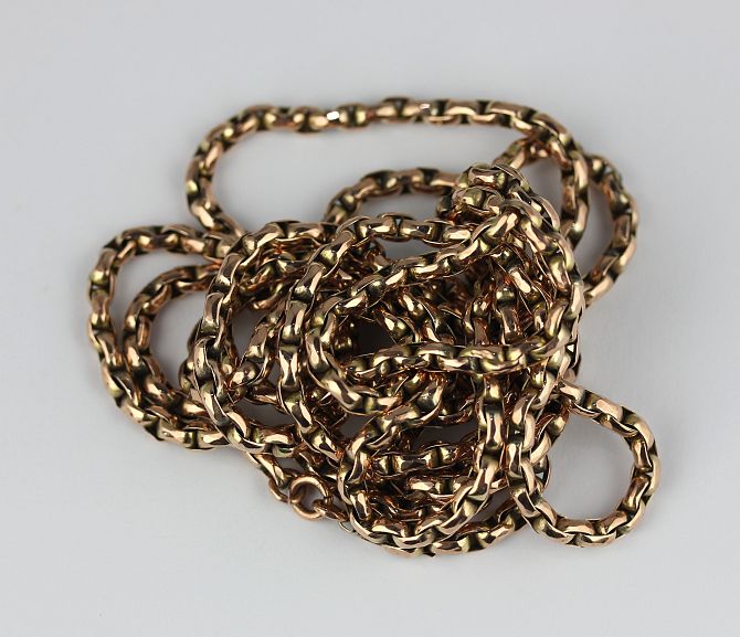 A gold oval link long guard muff chain, length 142cm, weight 42.3g