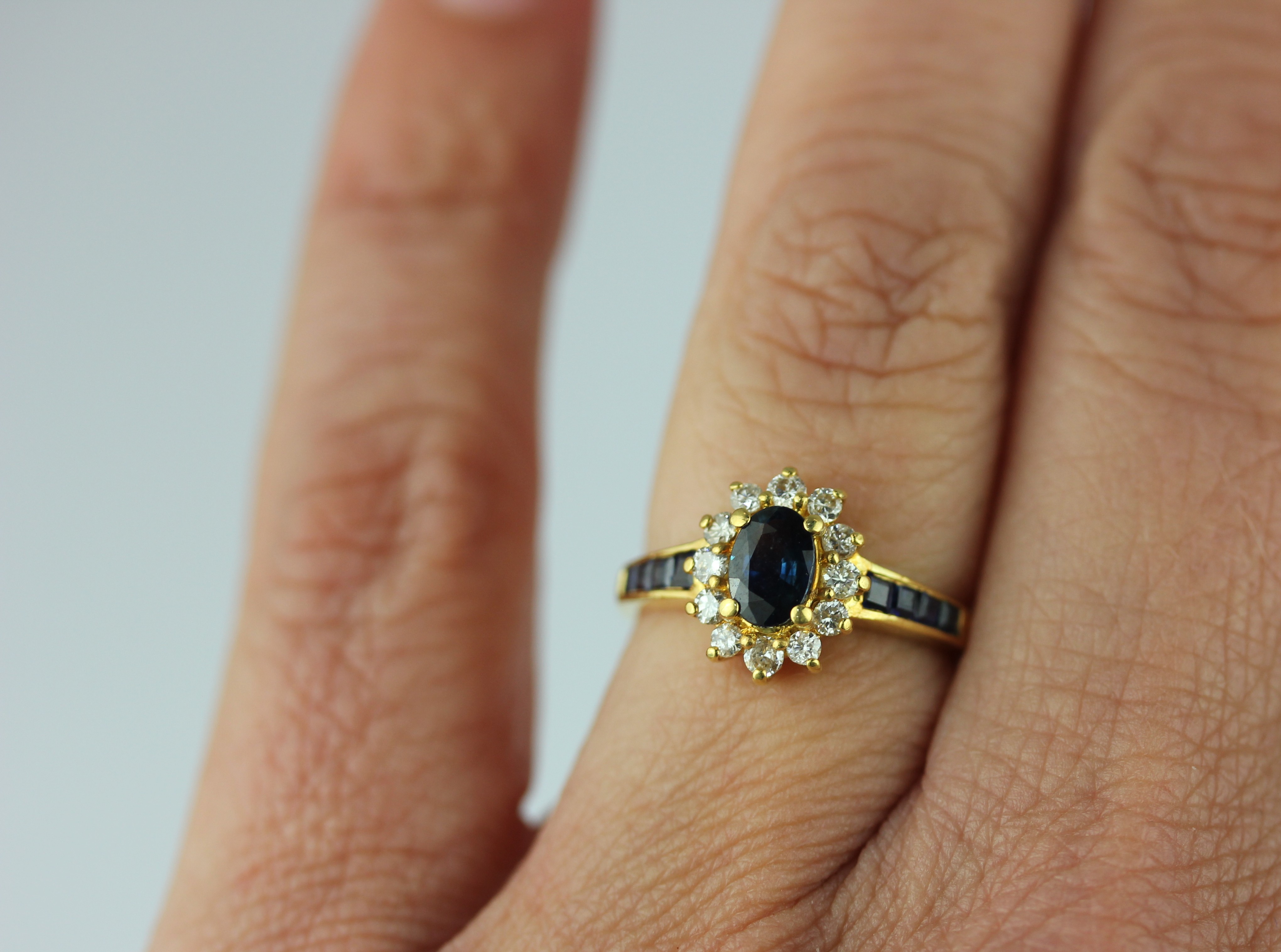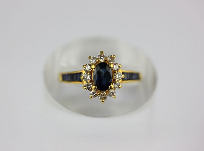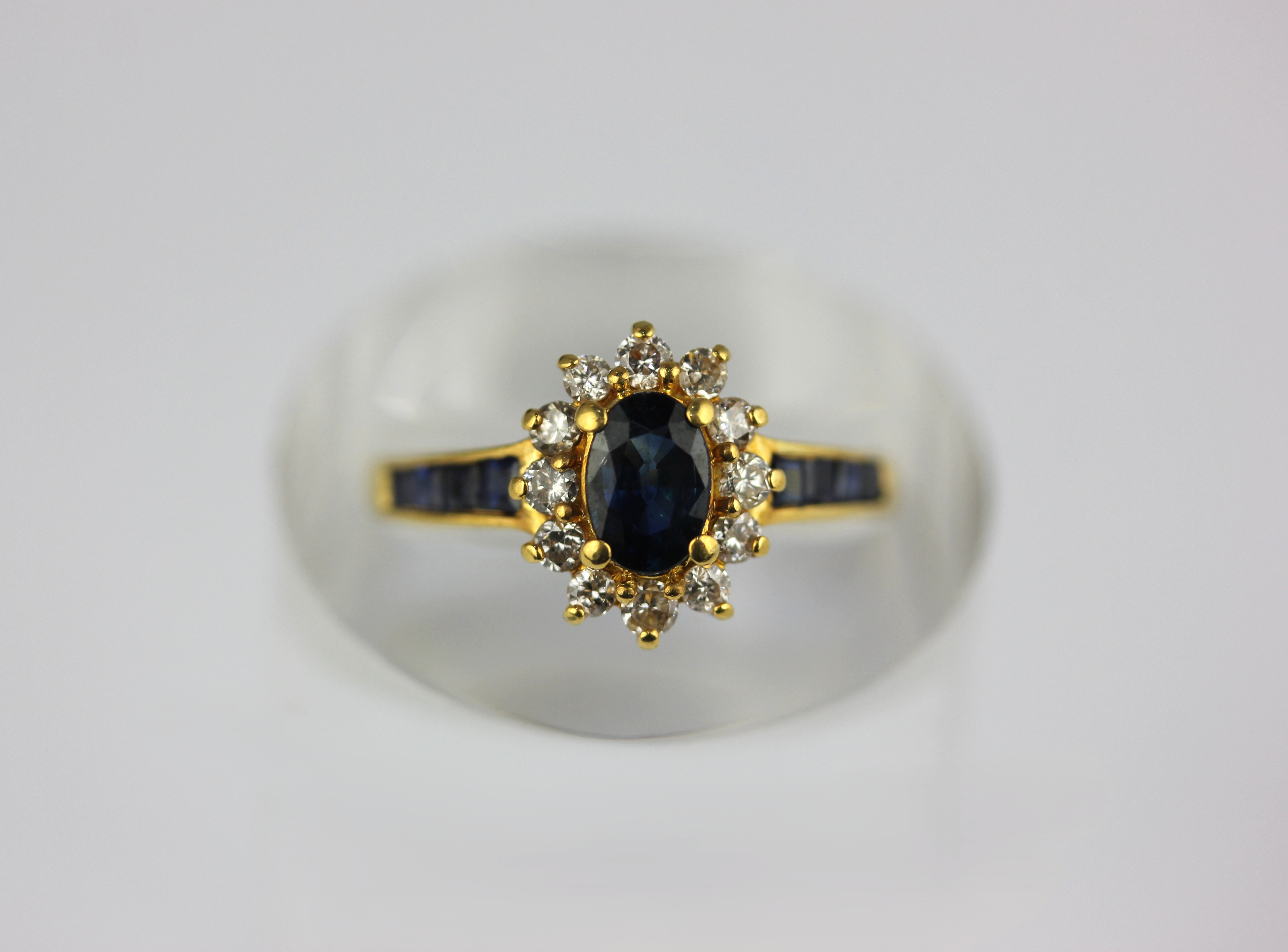 An 18ct gold, sapphire and diamond oval cluster ring claw set with the oval cut sapphire in a surround of twelve circular cut diamonds