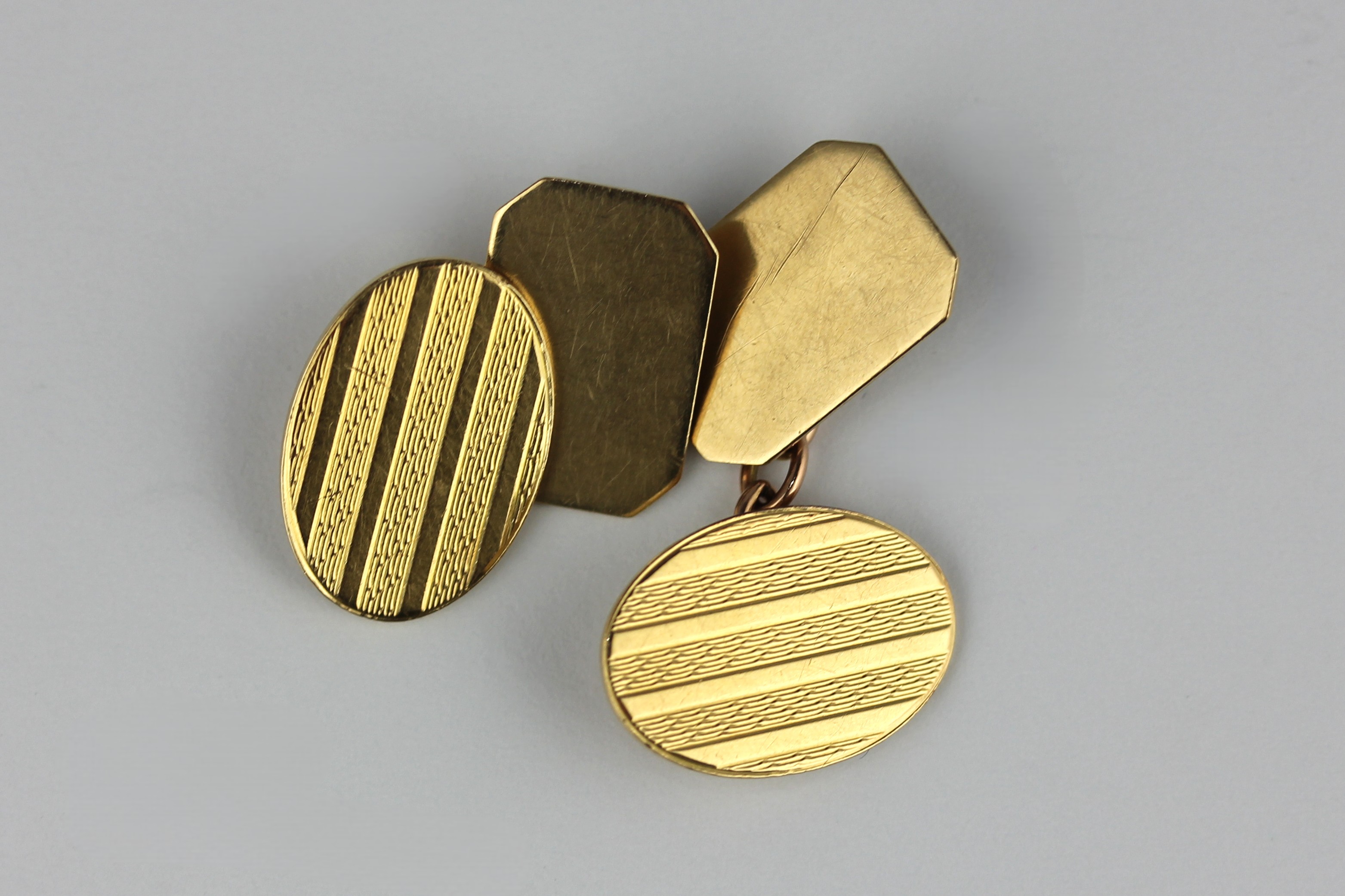 A pair of two-gold cufflinks, the oval side 18ct, the rectangular side 9ct, combined gross weight 8.5g, with a case
