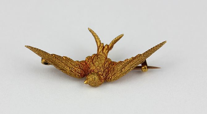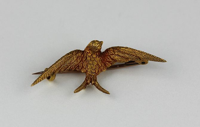 An Edwardian gold brooch designed as a swallow in flight, detailed 15ct, width 3.5cm, weight 2.2g
