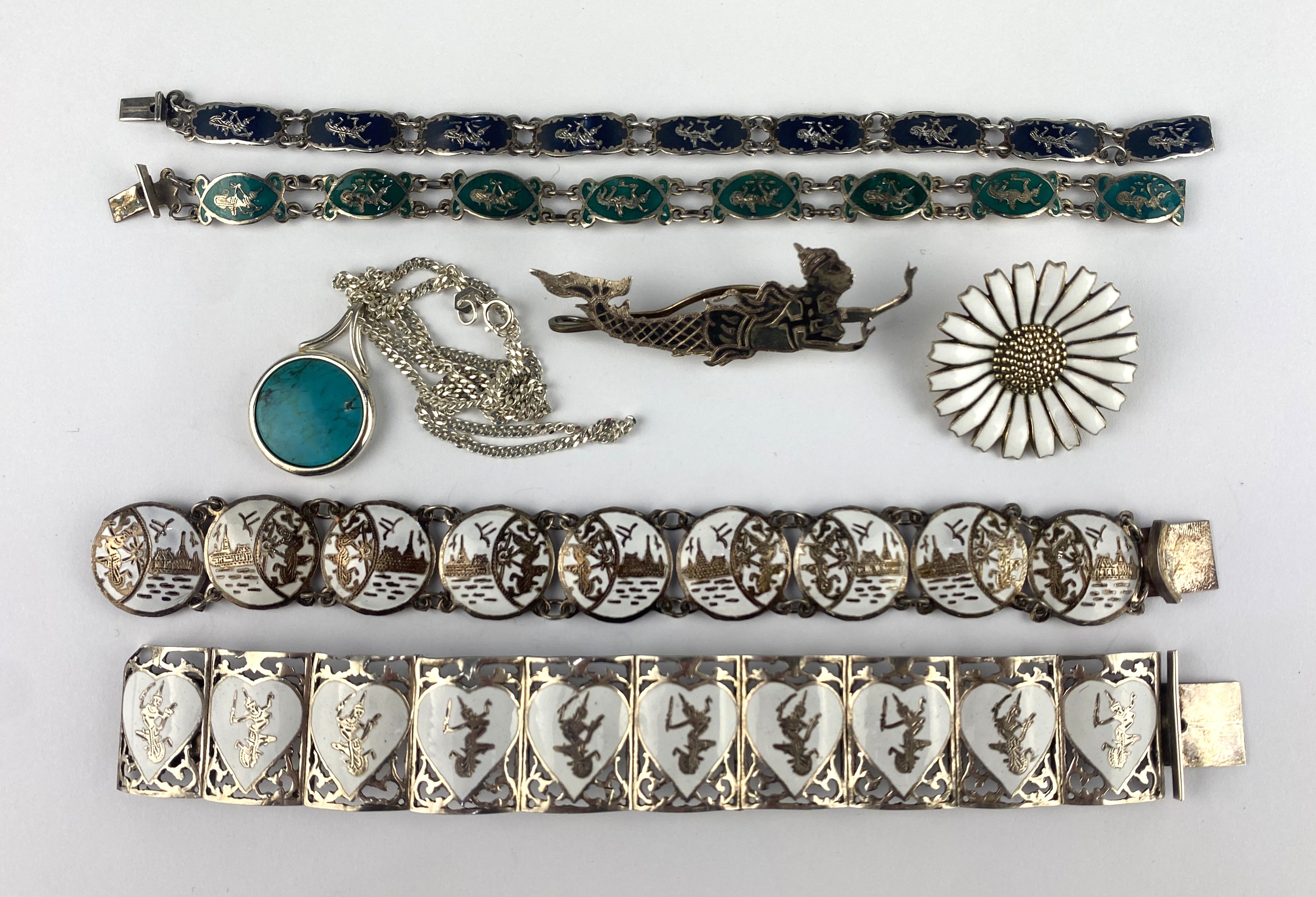 A Danish silver and turquoise pendant with a silver neckchain, a Danish silver and white enamelled flowerhead brooch and a group of Siamese silver jewellery comprising four bracelets and a tie slide
