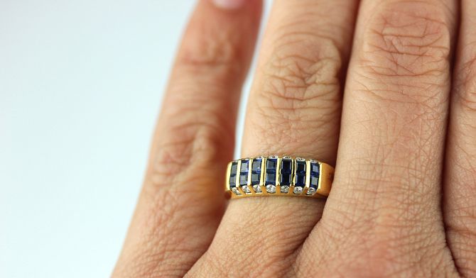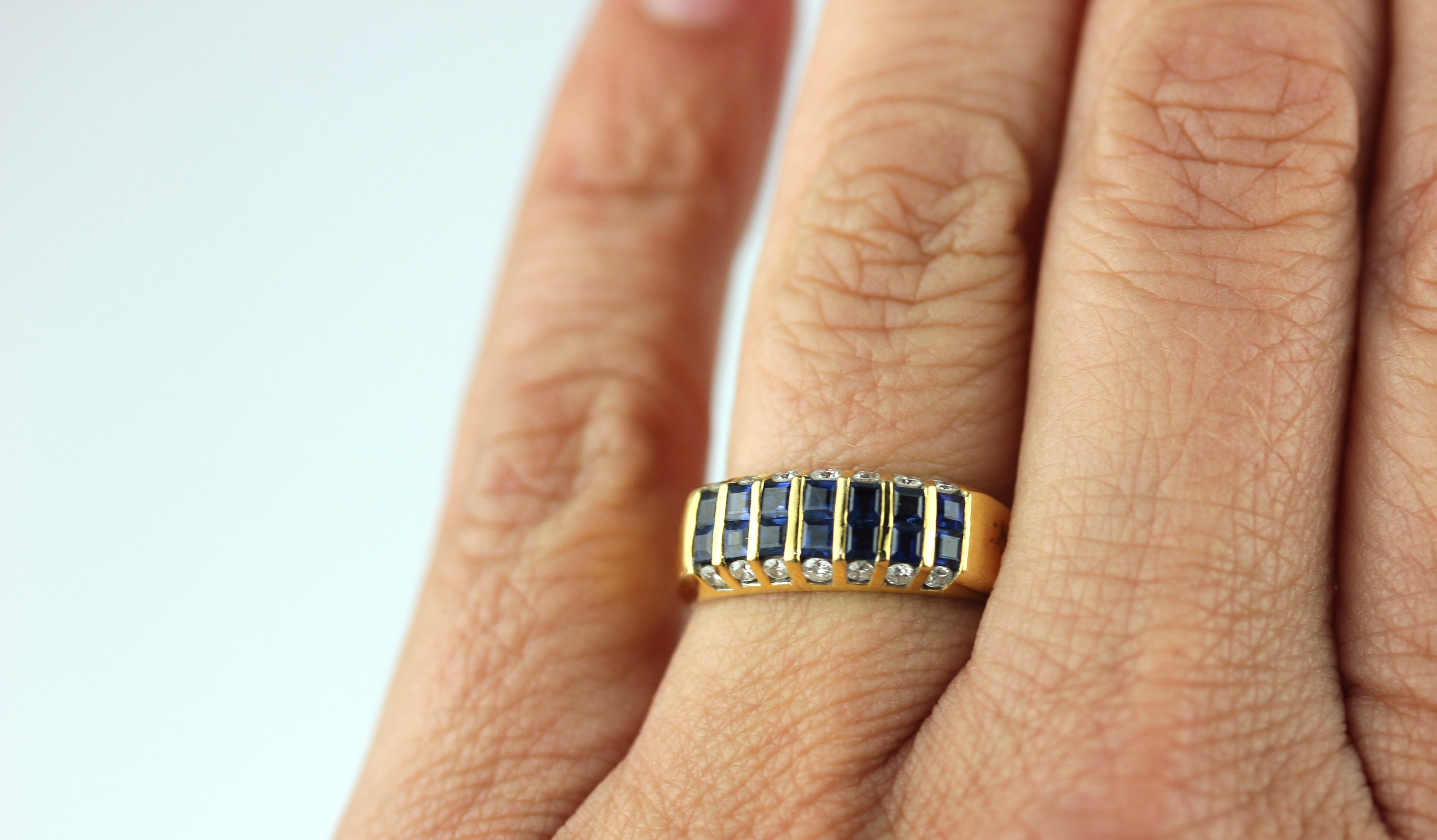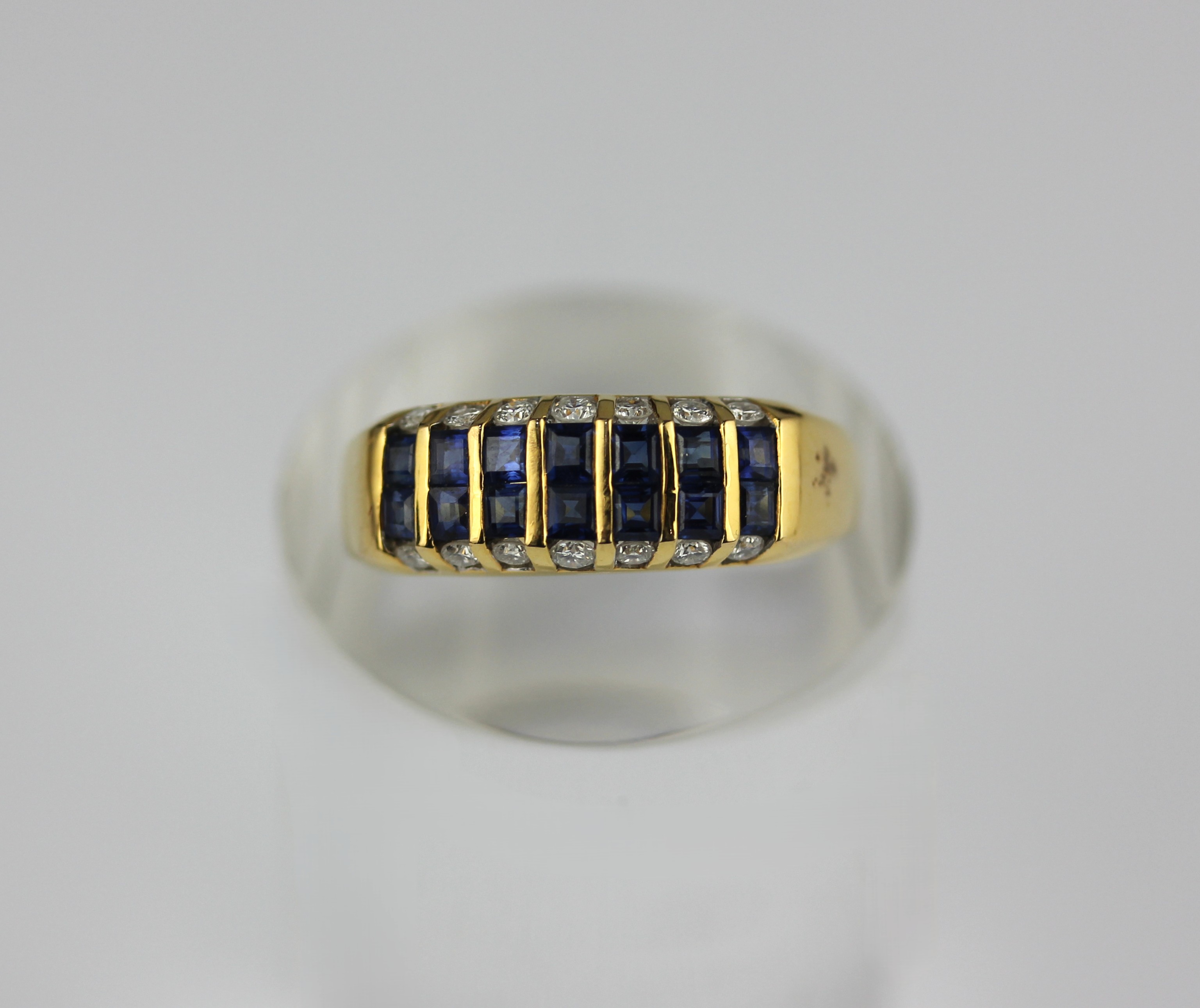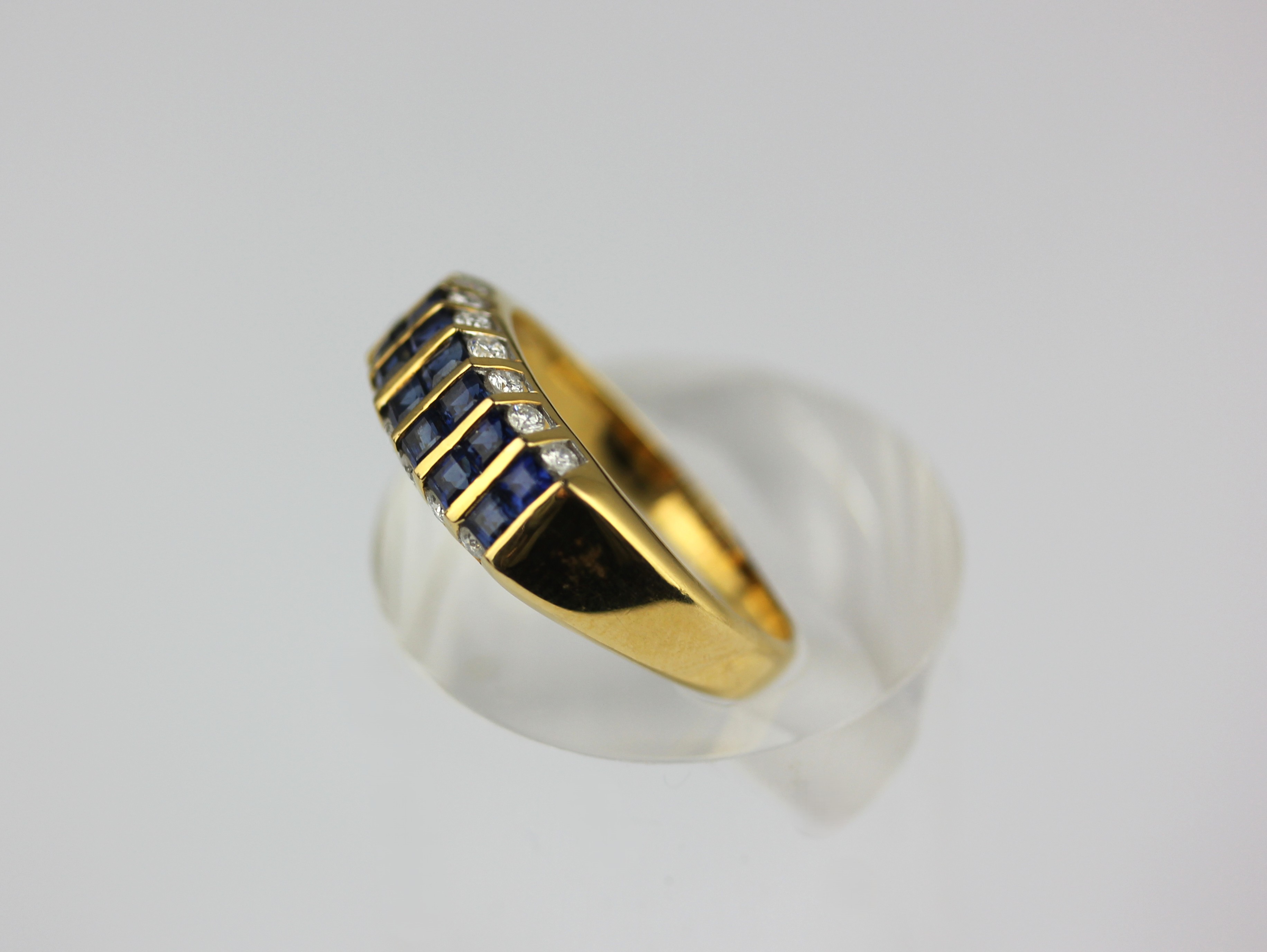 A gold, sapphire and diamond ring mounted with rows of square cut sapphires and with rows of circular cut diamonds, detaile d750, size O, gross weight 4.3g, with a case