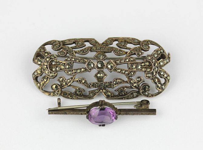 A marcasite brooch in a pierced panel design and an amethyst bar brooch