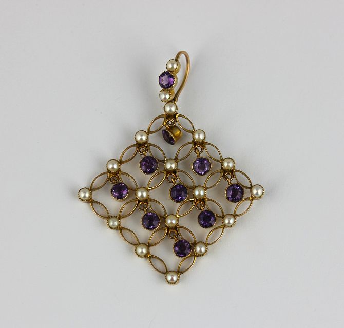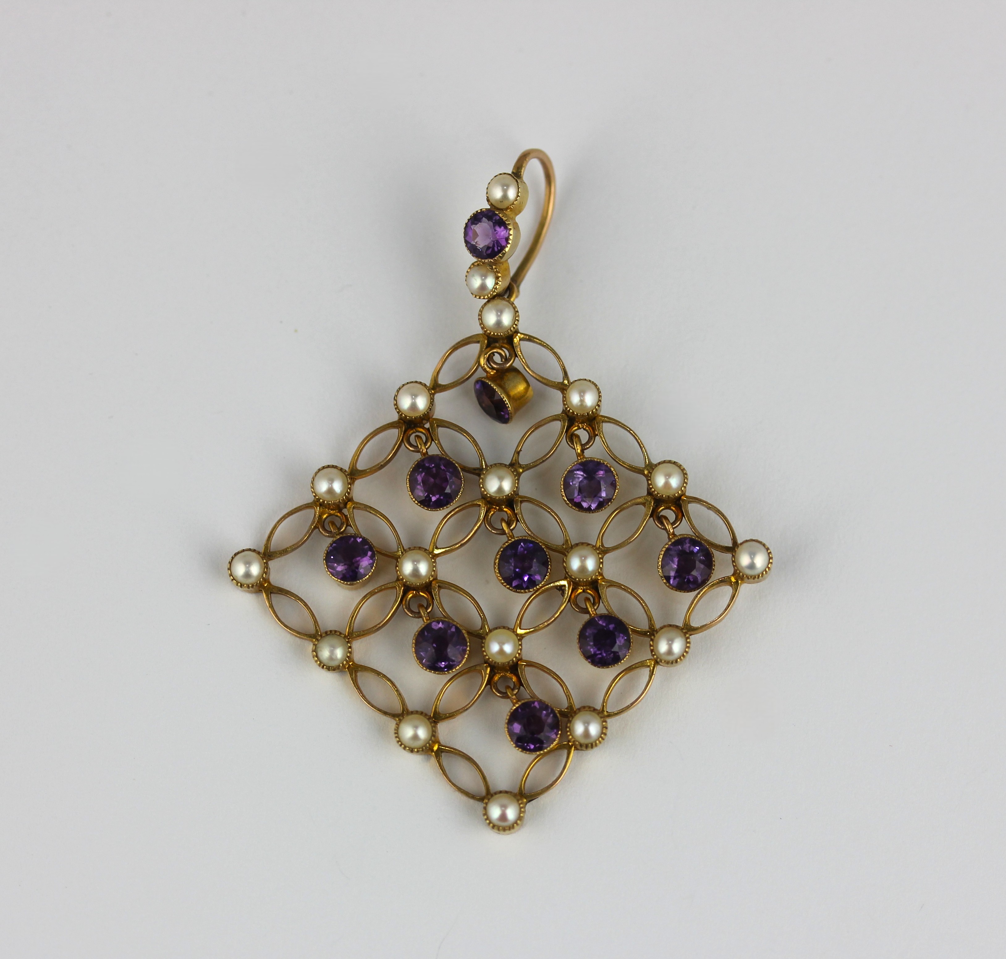 A gold, amethyst and half pearl set pendant in a pierced open work design, collet set with circular cut amethysts to the drops and otherwise set with half pearls, 4.3 cm across, gross weight 7.8g