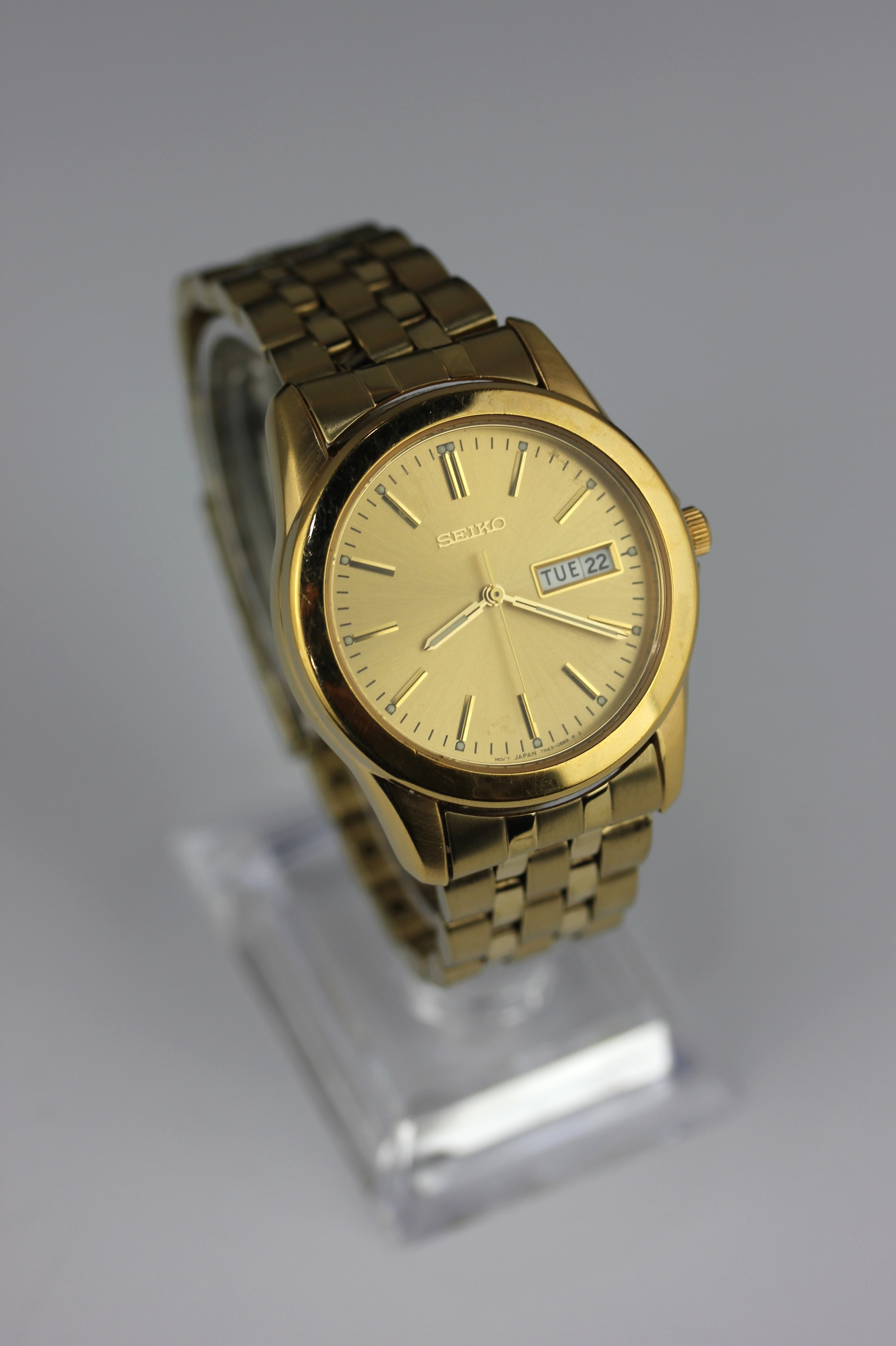 A Seiko quartz satinless steel gilt wristwatch with day and date aperture, spare links, and case