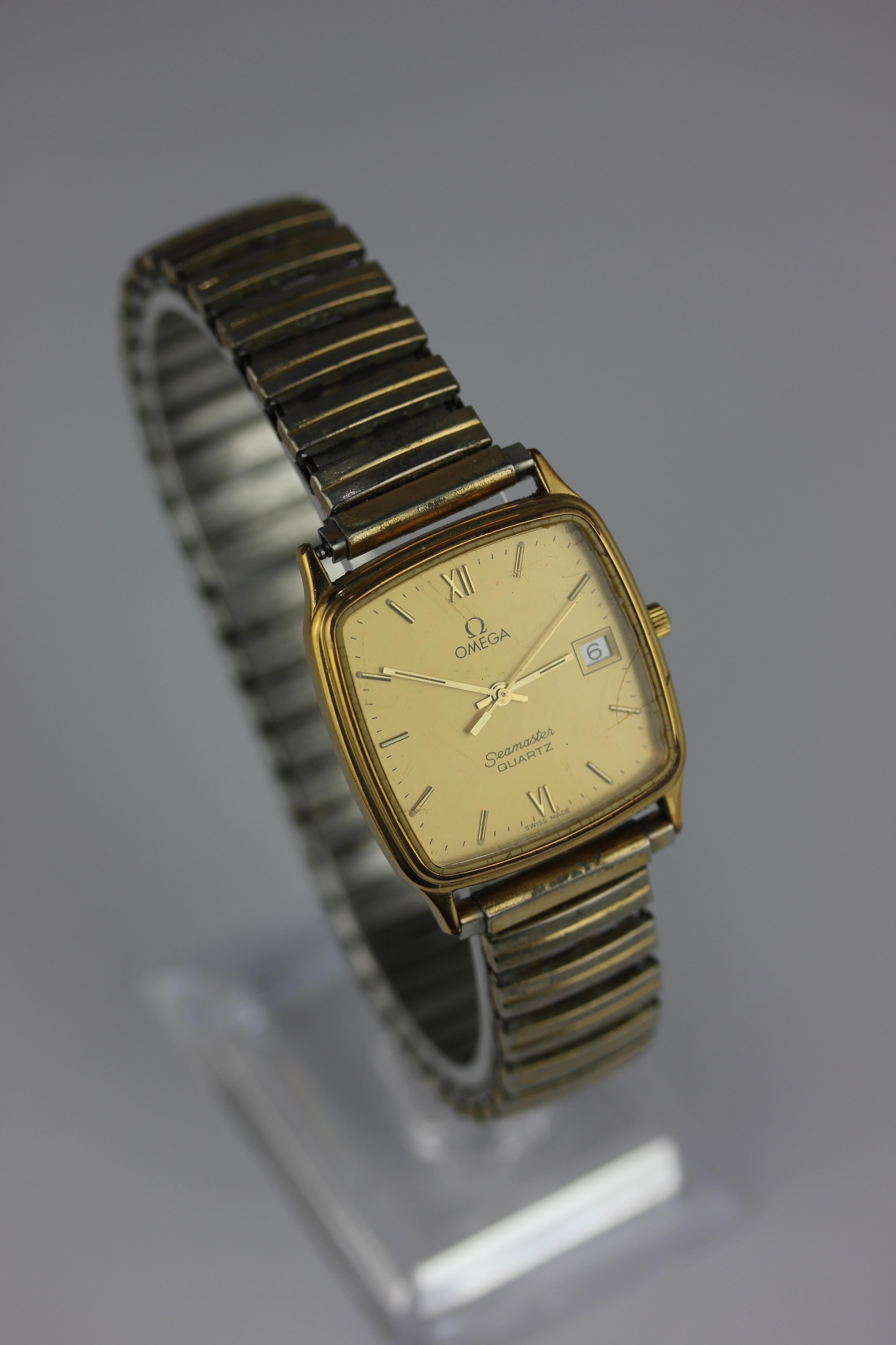 An Omega Seamaster Quartz gilt metal front and steel backed gentlemans wristwatch on an associated expanding metal bracelet