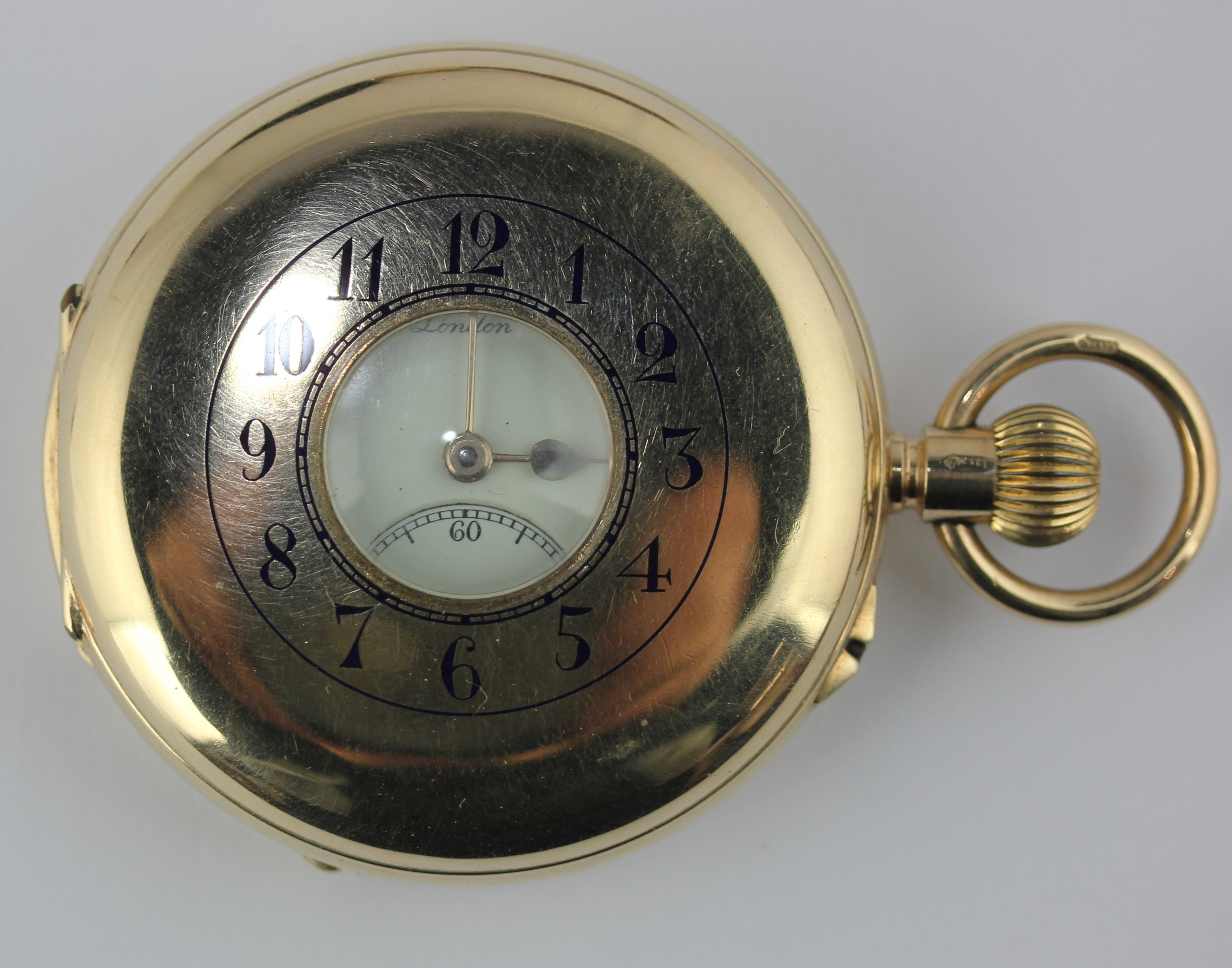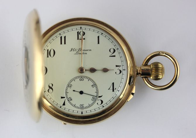 A . J. W. Benson, London 9ct gold cased keyless wind 1/2 Hunting case gentlman's pocket watch with a signed gilt jewelled lever movement detailed The Field S. 2601. 9ct gold inner case presentation inscribed. The signed enamel dial with arabic numerals. London 1928, case diameter 5cm, gross weight 114.5g, with original case.