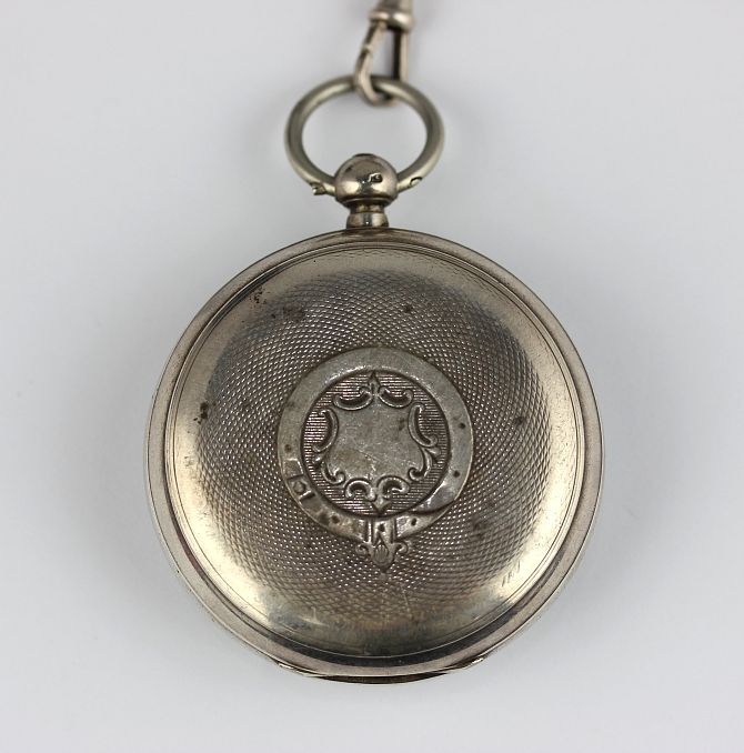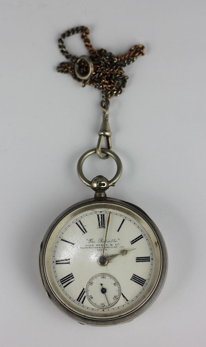 A silver cased key wind open faced gentlemans pocket watch, gilt lever movement detailed 'John Myens and Co, London 15039' with a gilt dust cover and signed dial, Birmingham 1895, with a two tone chain
