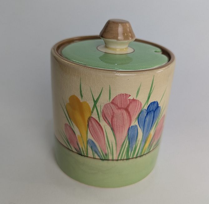 A Clarice Cliff 'Spring Crocus' pattern preserve pot and cover 10cm high