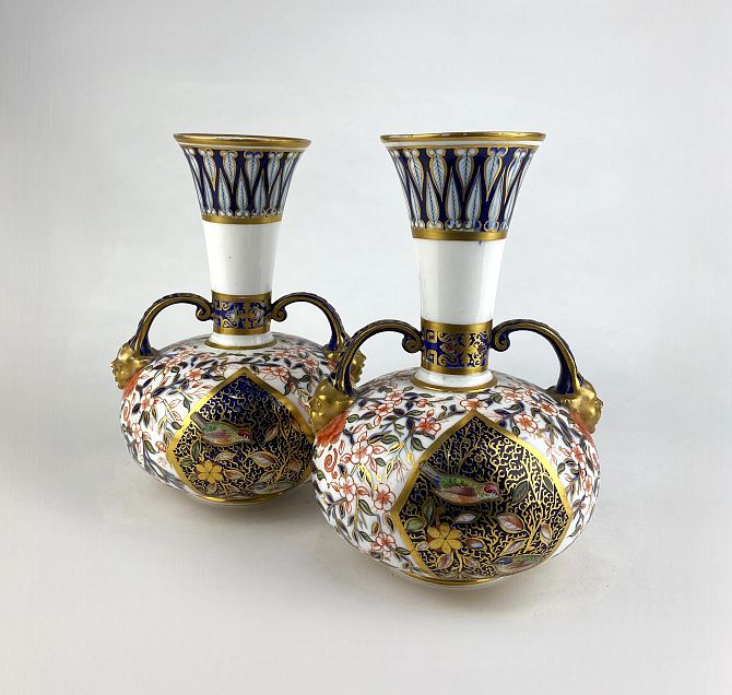 A pair of Royal Crown Derby twin handled bottle vases, decorated in the imari palette and with panels of birds, between mask terminals, factory marks to underside, 20cm high.