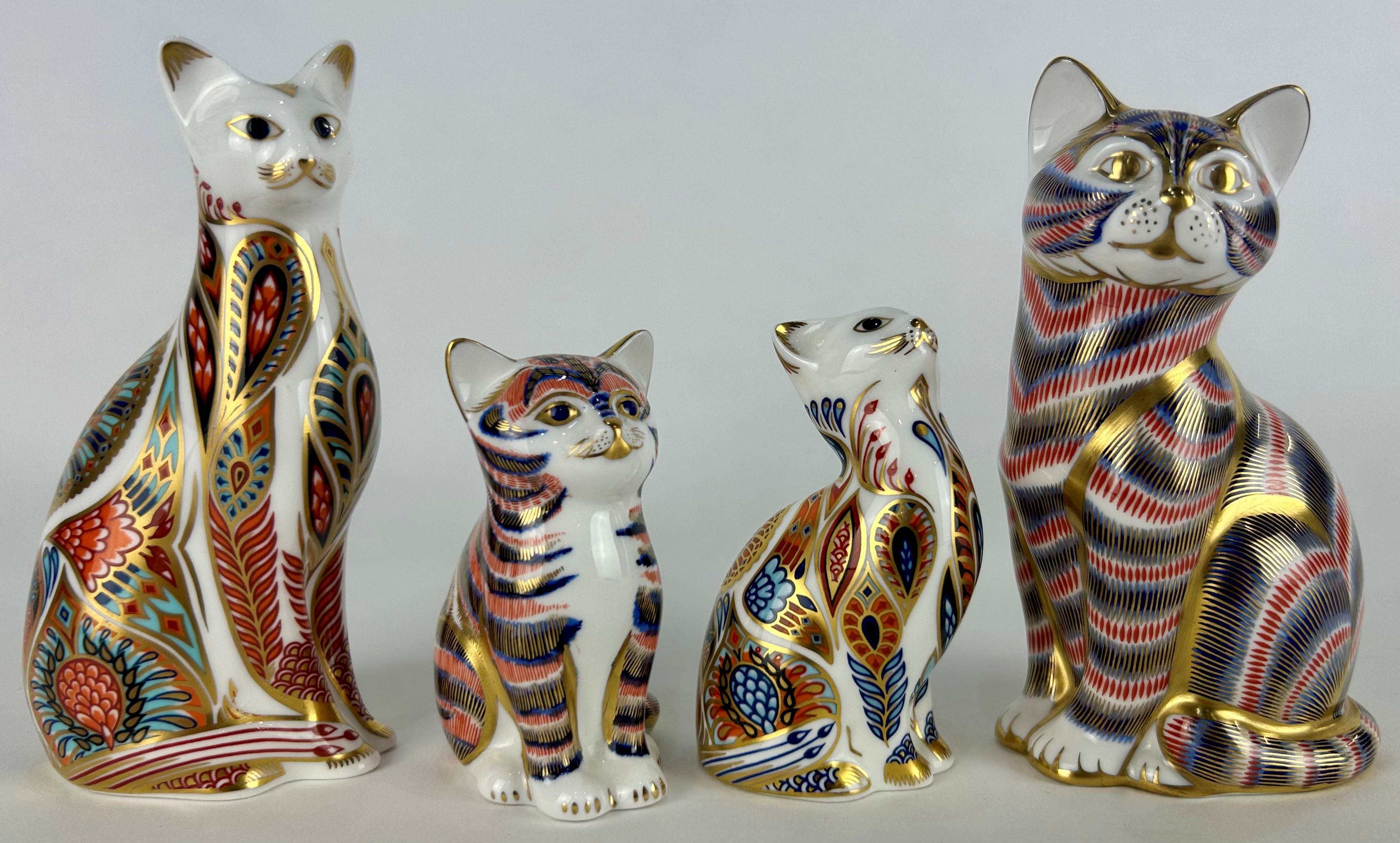 Four Royal Crown Derby porcelain cat paperweights comprising an Imari pattern cat and kitten tallest 13cm, and a Siamese cat and kitten tallest 13.5cm