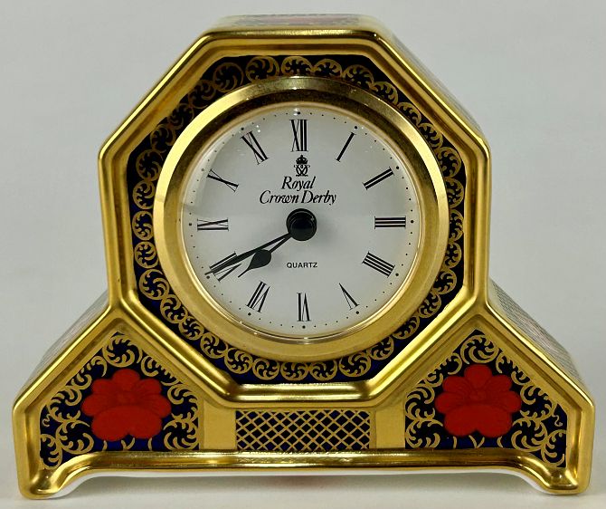 A Royal Crown Derby porcelain Old Imari 1128 pattern desk clock, the circular dial with Roman numerals, 10.5cm high
