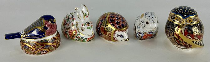 A collection of five Royal Crown Derby porcelain paperweights comprising Little Owl 8cm high, Bullfinch Nesting 7cm high, Orchard Hedgehog, Meadow Rabbit (a/f) and Poppy Mouse (a/f)