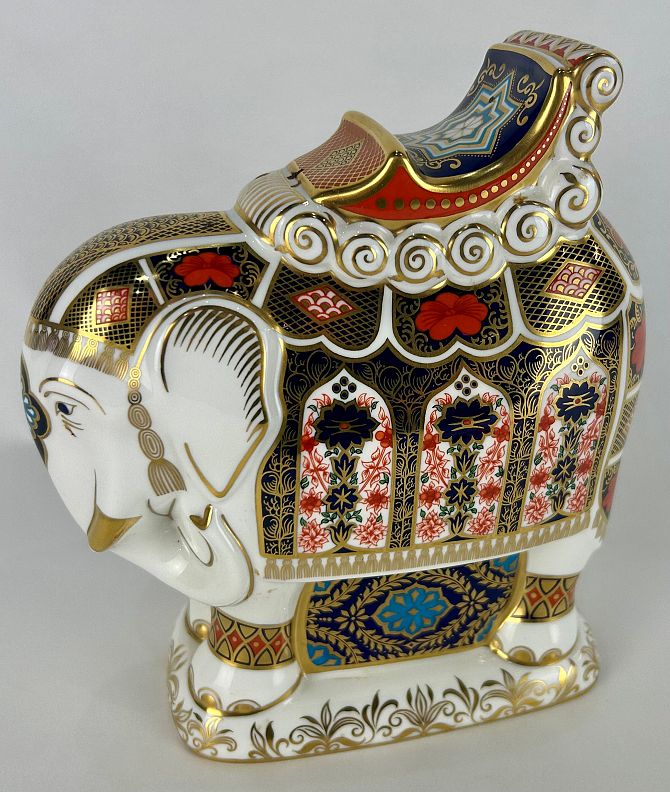 A Royal Crown Derby porcelain large Imari Elephant paperweight, decorated in the 1128 pattern, 21.5cm high