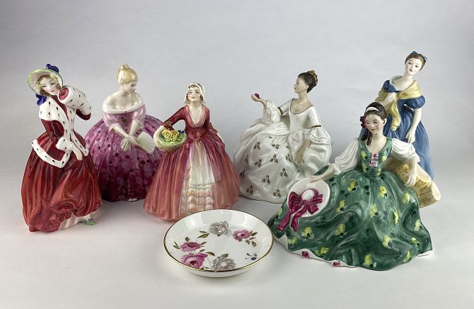 Six Royal Doulton porcelain figures of ladies to include My Love HN2339 17cm high, Elyse HN2474 17cm, and Victoria 18.5cm, together with a Royal Worcester 'Marissa' pattern trinket dish